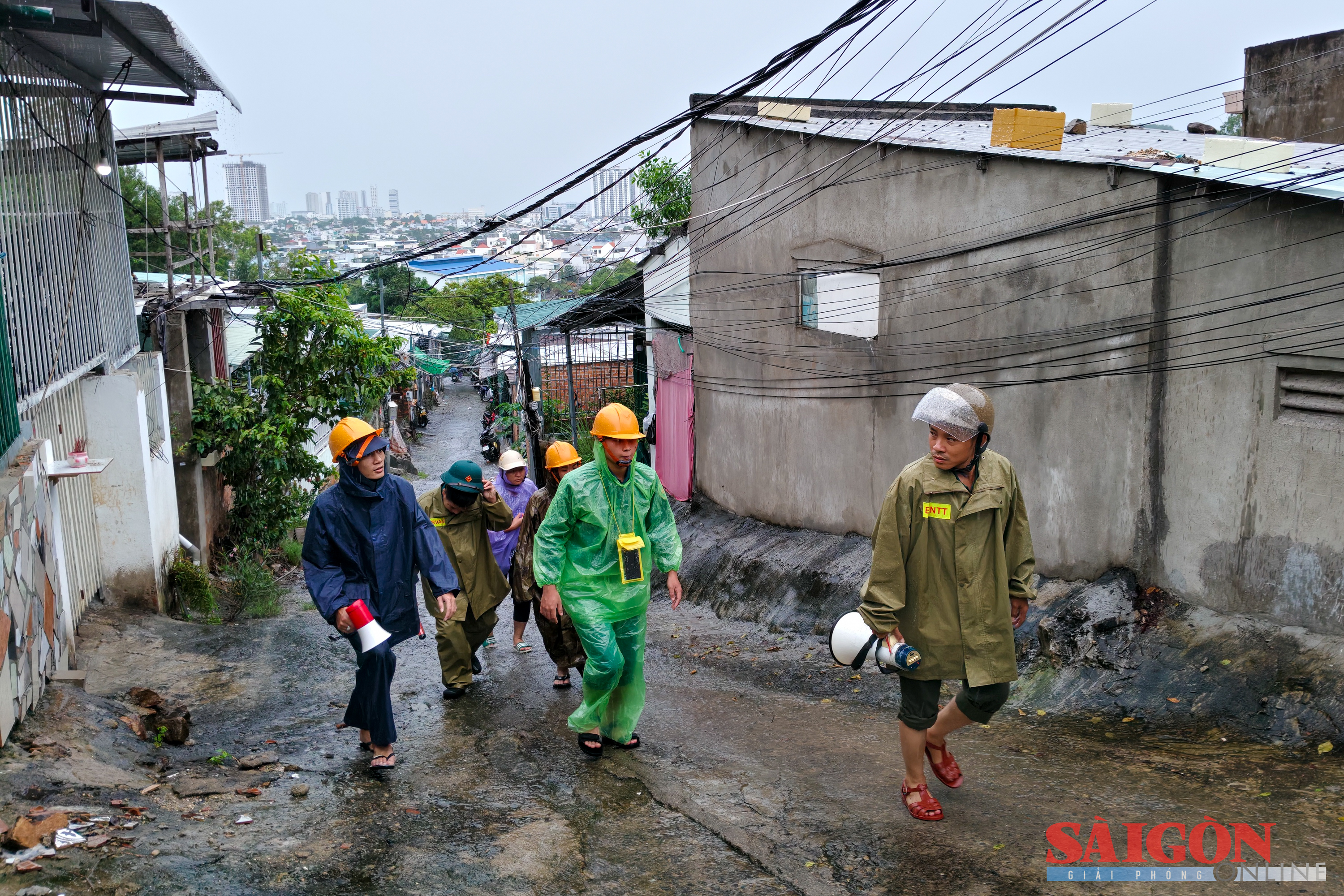 8 giờ sáng 6-11, trong cơn mưa tầm tã do ảnh hưởng bão số 13 (Kalmaegi), chị Nguyễn Hoài Thương (khu dân cư Xóm Núi) vội vã thu dọn đồ đạc, mang theo nhu yếu phẩm để rời khỏi khu vực có nguy cơ sạt lở.