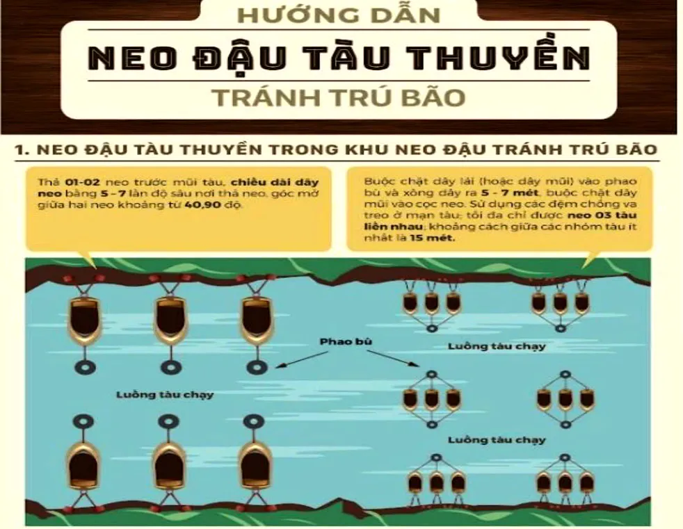 Trung tâm quán triệt các đơn vị thường xuyên kiểm tra tuyến luồng và vùng nước neo đậu, hướng dẫn ngư dân thực hiện đúng kỹ thuật chằng néo, buộc dây đôi hoặc dây chéo, bảo đảm mỗi tàu có ít nhất hai mỏ neo giữ cố định đầu và đuôi tàu, sử dụng dây neo có độ bền cao và kiểm tra lại mối nối trước khi bão đổ bộ. Sắp xếp tàu theo công suất, kích cỡ, đảm bảo khoảng cách hợp lý giữa các tàu để tránh va đập khi sóng gió lớn. Bố trí khu vực neo đậu riêng cho tàu chở dầu, tàu có hàng nguy hiểm, thường xuyên giám sát để phòng ngừa sự cố gây ảnh hưởng đến môi trường.