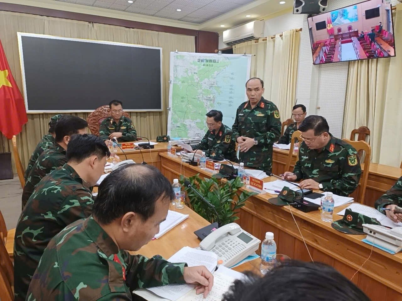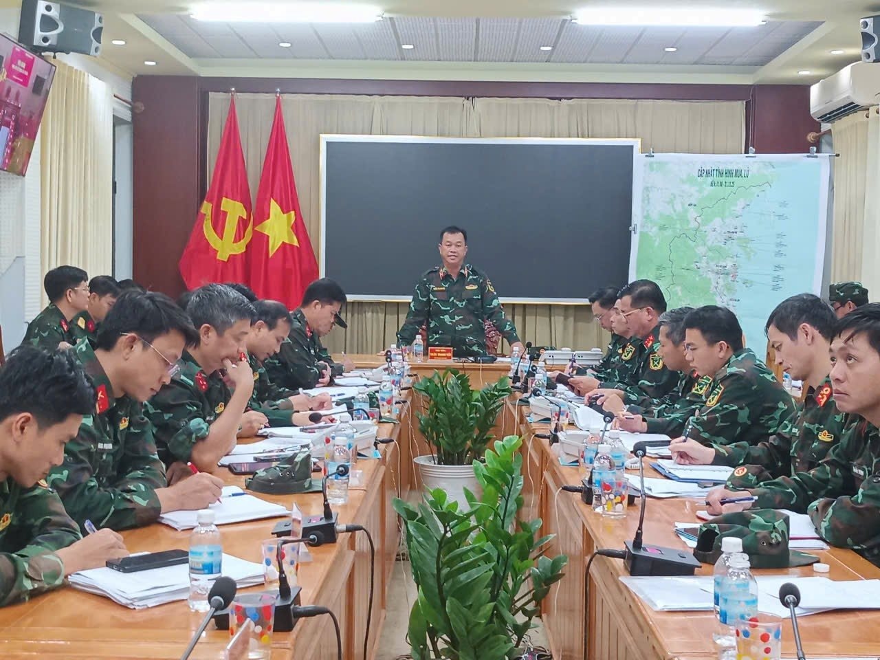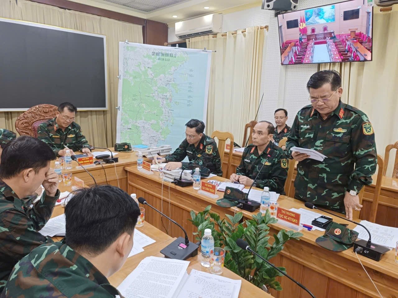Thiếu tướng Trần Thanh Hải, Phó Tư lệnh Quân khu 5 chủ trì cuộc họp triển khai ứng phó và khắc phục hậu quả mưa lũ tại tỉnh Khánh Hòa.