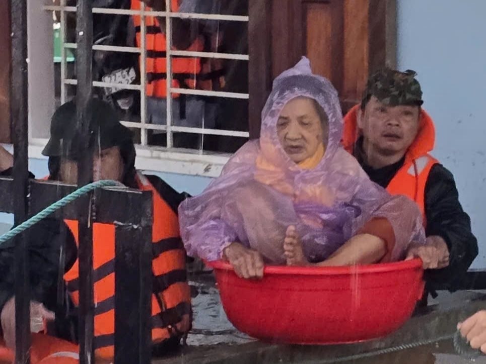 Lực lượng cứu hộ đưa một cụ bà ra khỏi khu vực ngập sâu bằng thau nhựa, đảm bảo an toàn trong điều kiện mưa lớn.