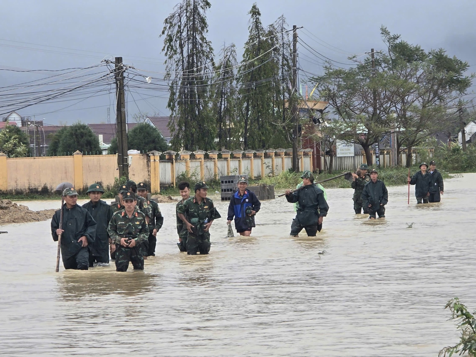 Lực lượng quân đội lội qua đoạn đường bị ngập sâu để tiếp cận khu vực xung yếu, hỗ trợ người dân trong mưa lũ.