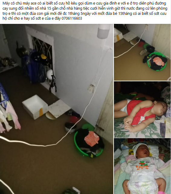 Nhiều gia đình có người già, trẻ nhỏ bị nước lũ cô lập phải đăng thông tin để chờ lực lượng chức năng ứng cứu