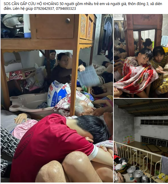 “Xã Diên Điền, tỉnh Khánh Hòa hiện có 50 người, bao gồm nhiều trẻ em, người già đang tập trung tại căn gác xép của một nhà dân cần hỗ trợ khẩn cấp”, tài khoản T.N.K. đăng tải nội dung và kèm theo số điện thoại của người dân trên mạng xã hội vào sáng 20-11. Tài khoản T.N.H. đăng tin: “Sáng 20-11, khu vực Gò Cây Sung, phường Tây Nha Trang, nước đã dâng cao tới nóc nhà, có 4 em bé và 15 người lớn cần hỗ trợ khẩn cấp”.