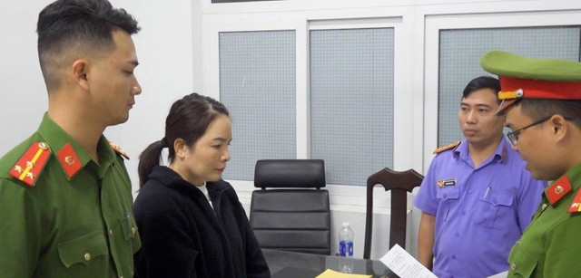 Cơ quan chức năng tống đạt quyết định khởi tố bị can và lệnh bắt tạm giam Hoàng Thị Thanh Tú. (Ảnh: CACC)