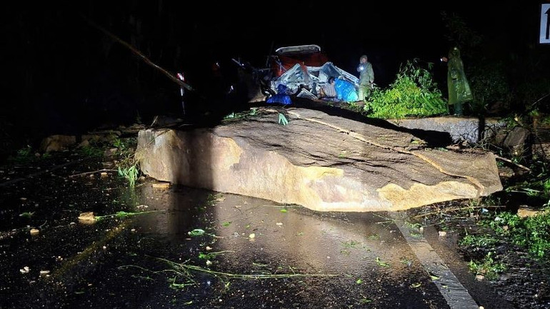 Đá lớn sạt lở gây tai nạn tại đèo Khánh Lê.