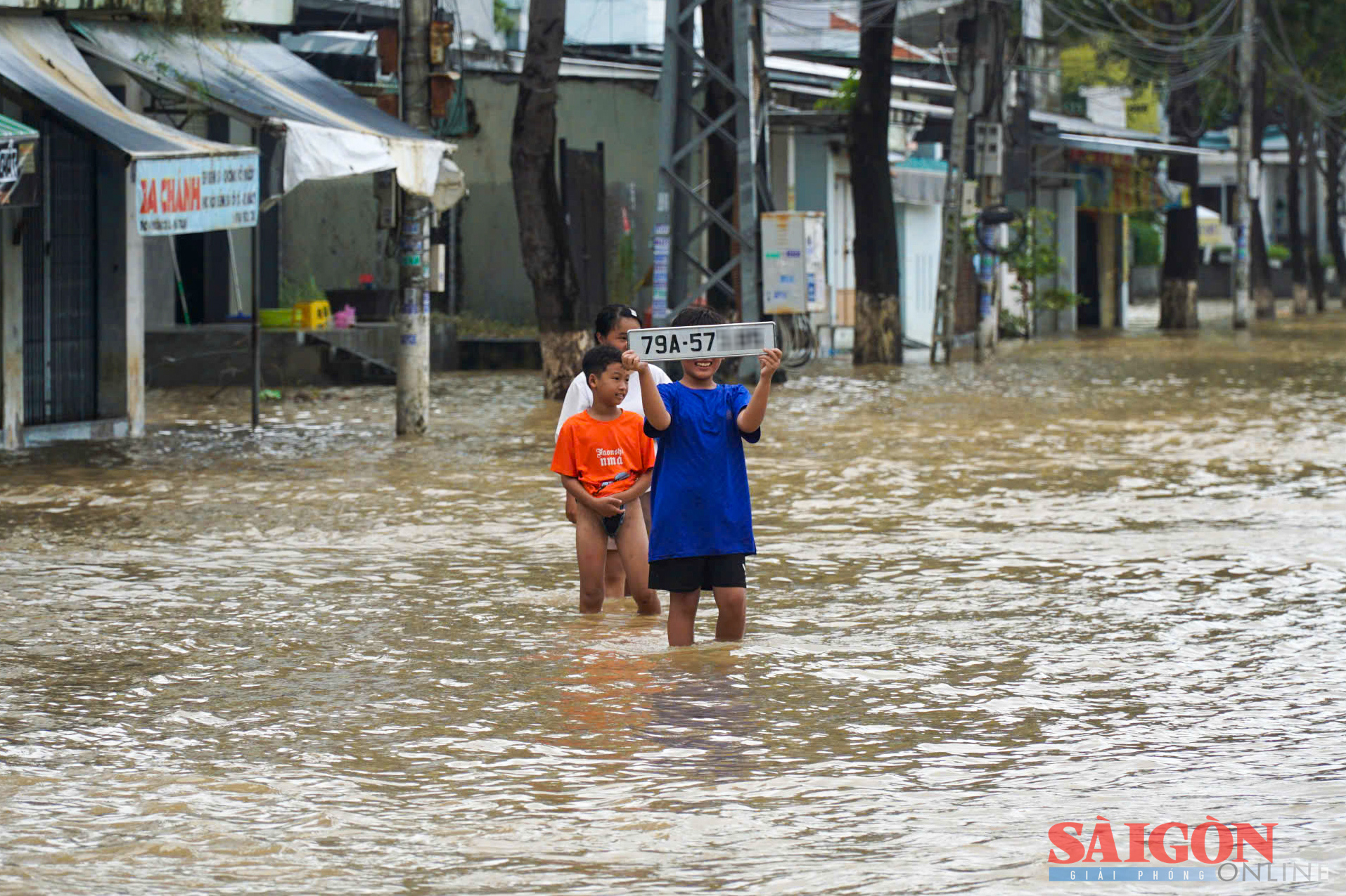 Trong khi đó, đường 23-10 (phường Tây Nha Trang) vẫn còn ngập sâu. Nhiều trẻ em nhặt được biển số xe bị lũ cuốn trôi