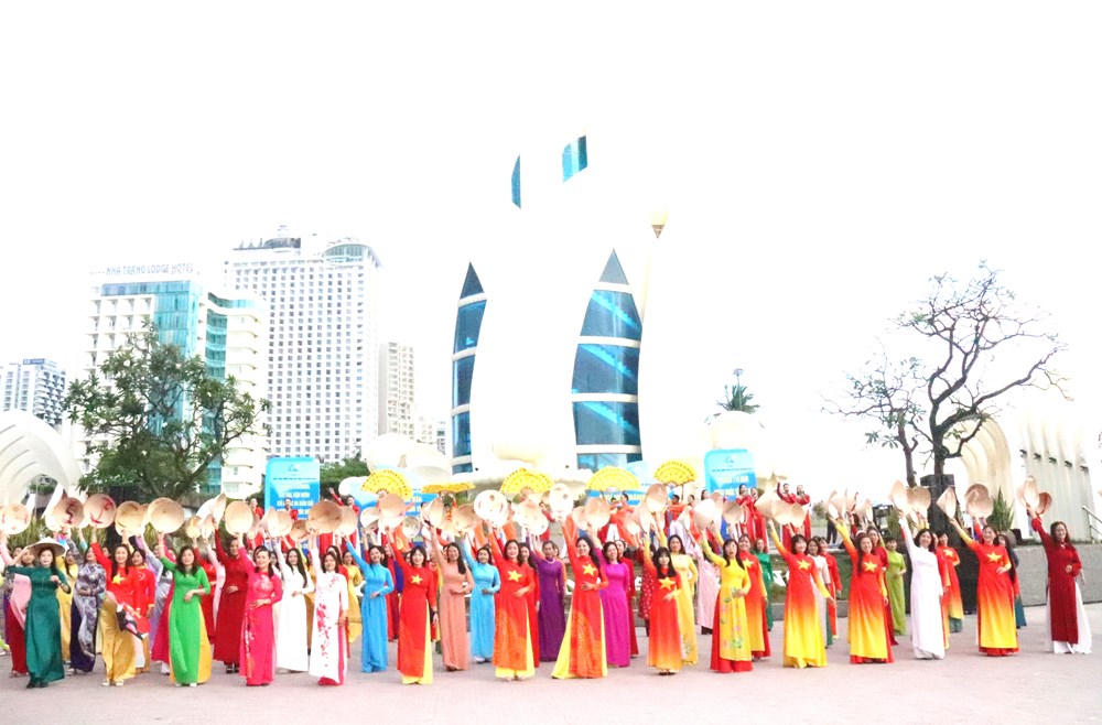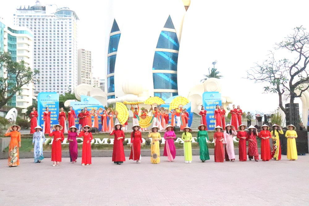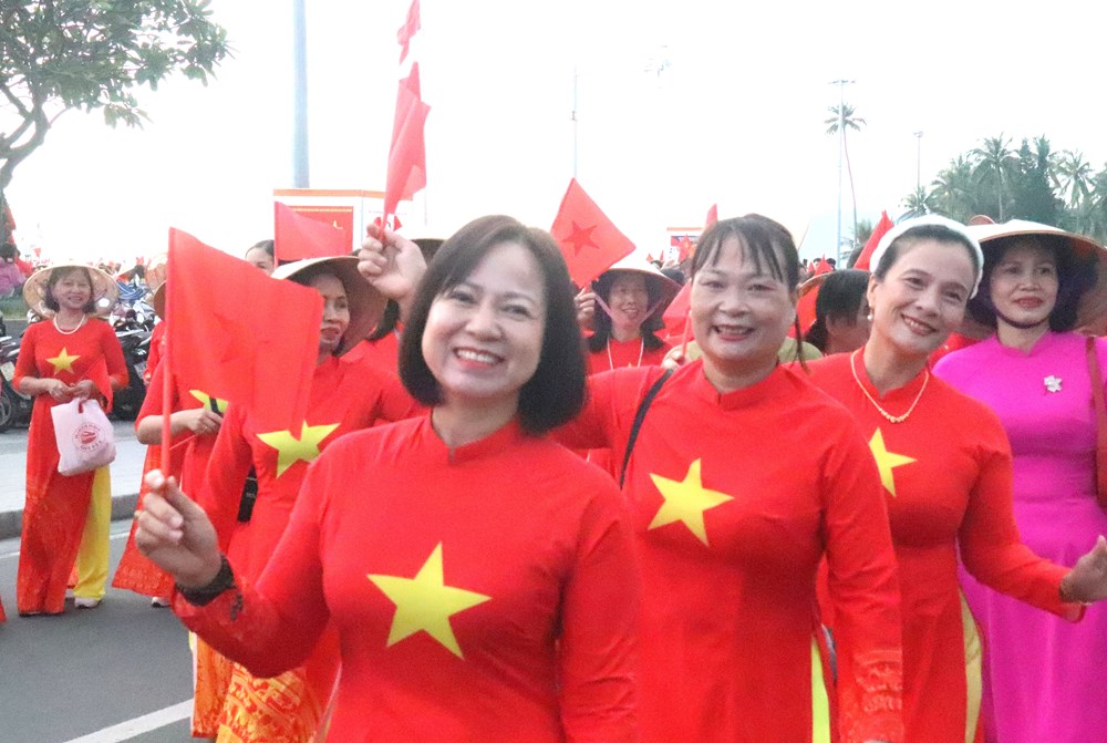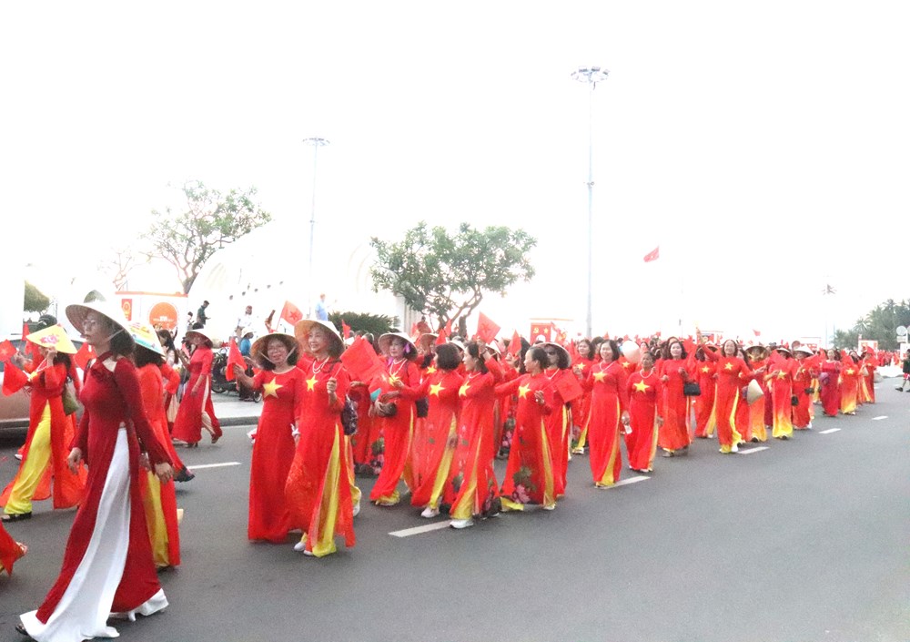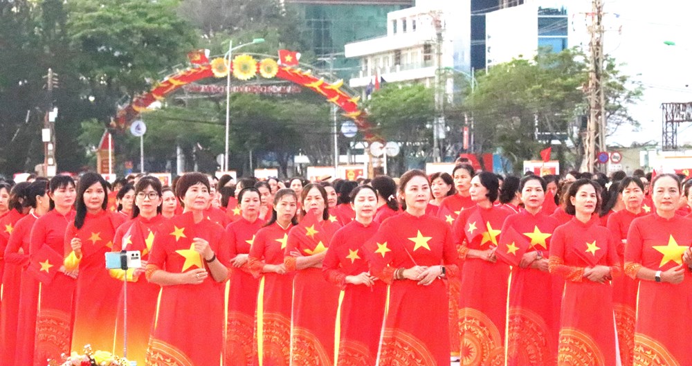 Dưới nắng vàng của cung đường Trần Phú, gần 3.000 hội viên phụ nữ đã tạo nên một "dải lụa" đa sắc, tôn vinh nét duyên dáng của trang phục dân tộc trên nền biển xanh biếc.