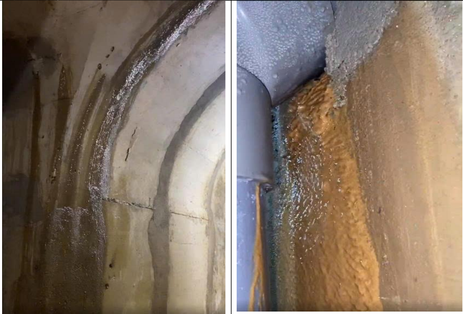 Dòng thấm xuất hiện tại nhiều vị trí hành lang kiểm tra trong thân đập bê tông. Ảnh: Công ty TNHH MTV Khai thác các công trình thủy lợi Ninh Thuận