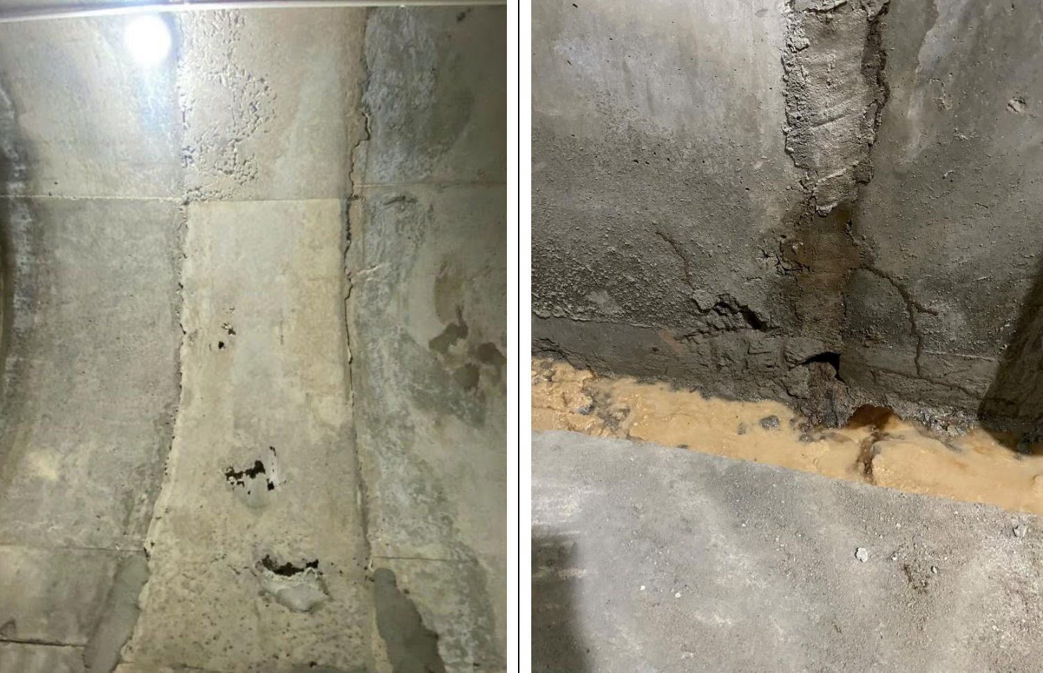 Bê tông bị tróc, rỗ tường hầm hành lang kiểm tra trong thân đập bê tông. Ảnh: Công ty TNHH MTV Khai thác các công trình thủy lợi Ninh Thuận