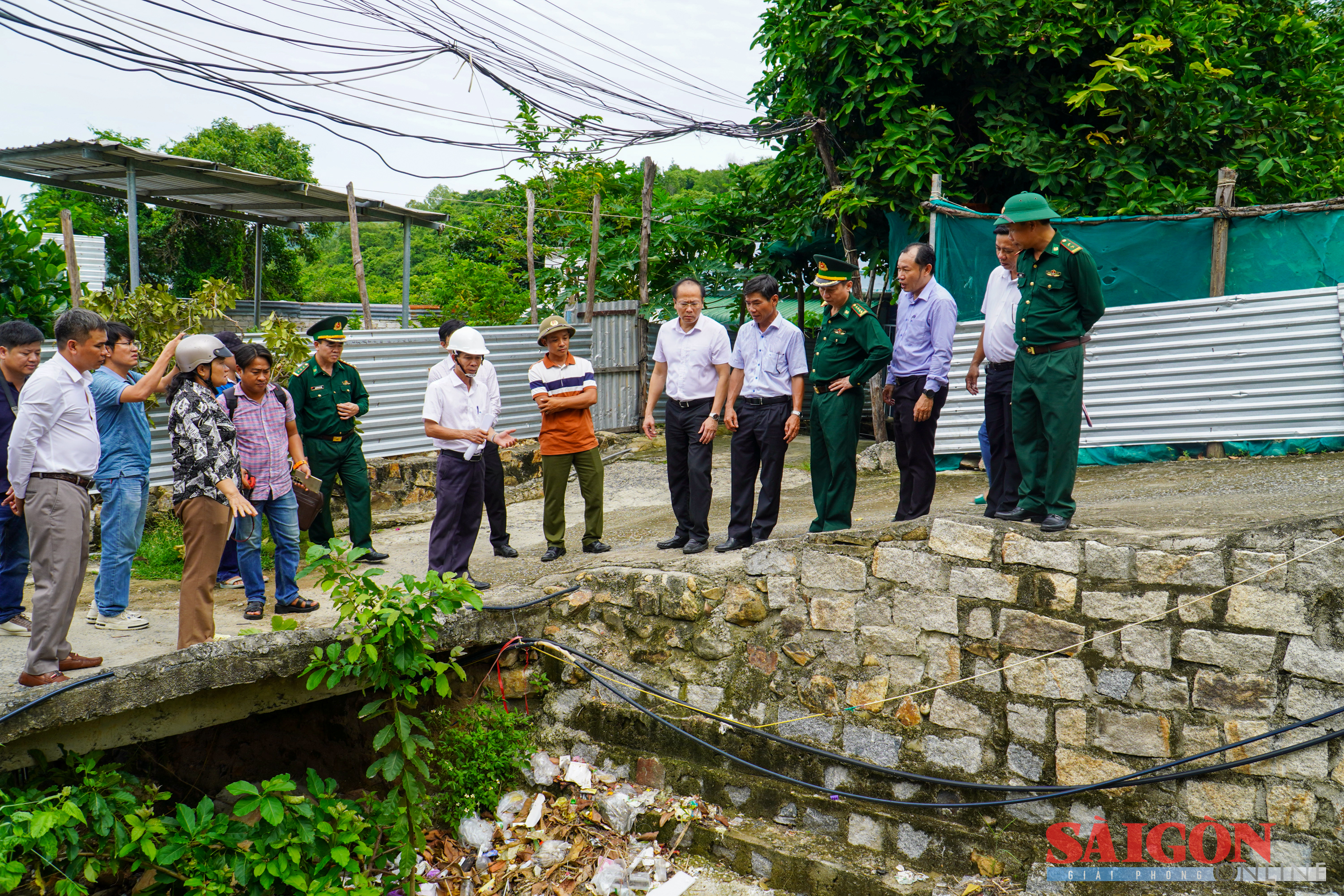 Ông Nguyễn Khắc Hà, Phó Bí thư Tỉnh ủy, Chủ tịch Ủy ban MTTQ Việt Nam tỉnh Khánh Hòa (bìa phải) và ông Nguyễn Văn Minh, Chủ tịch UBND phường Nam Nha Trang (bìa trái) kiểm tra tại tổ dân phố Thành Đạt, chiều 5-11