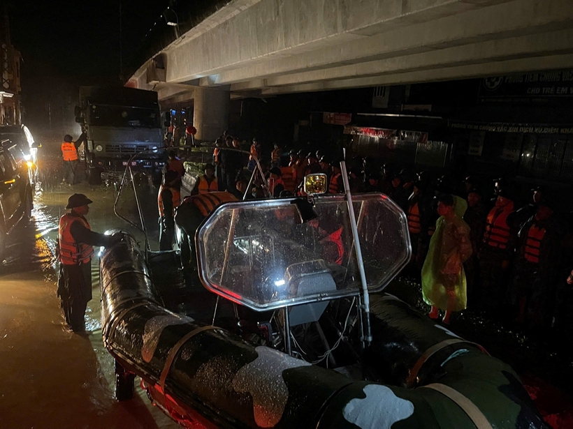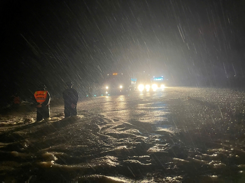 Lực lượng chức năng ứng trực tại các điểm ngập sâu trong đêm 19/11, sau khi nước dâng trở lại. Ảnh: BP.