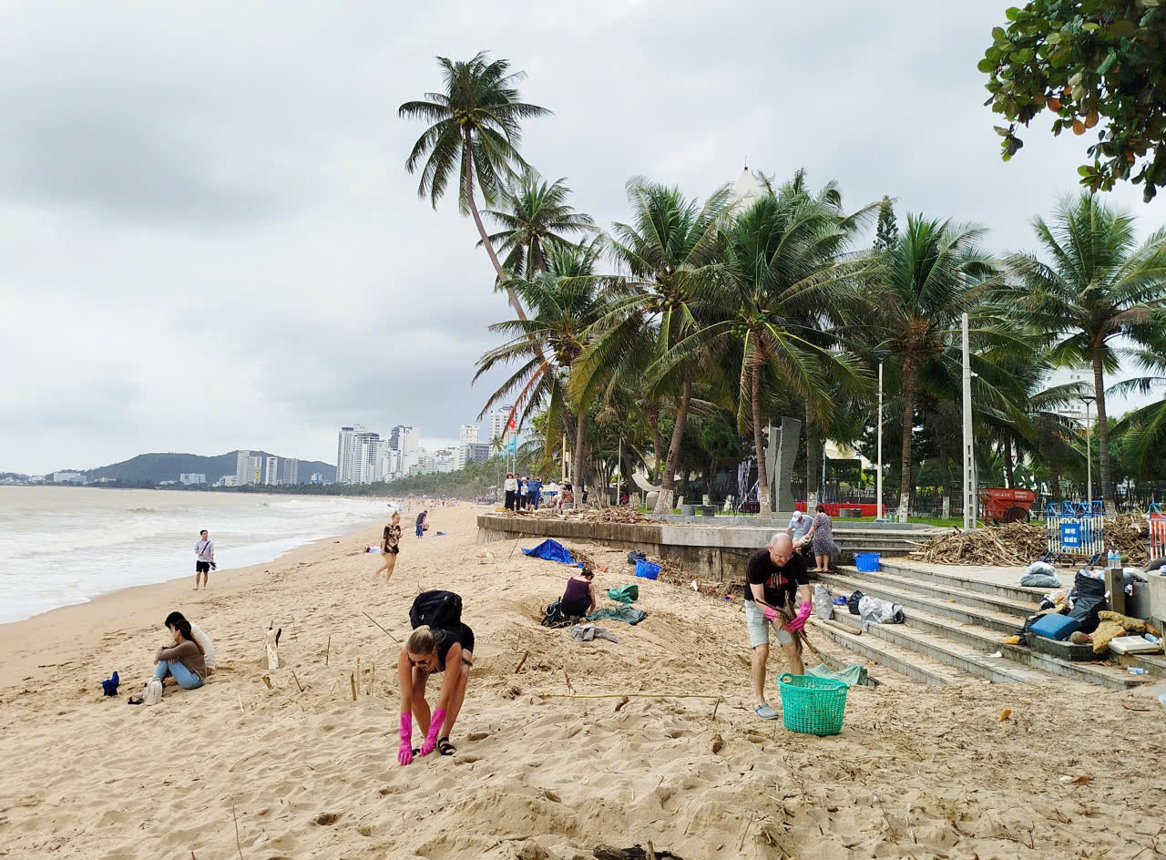 Du khách nước ngoài chung tay cùng người dân, cơ quan chức năng Khánh Hòa dọn dẹp bãi biển bị ảnh hưởng do mưa lũ