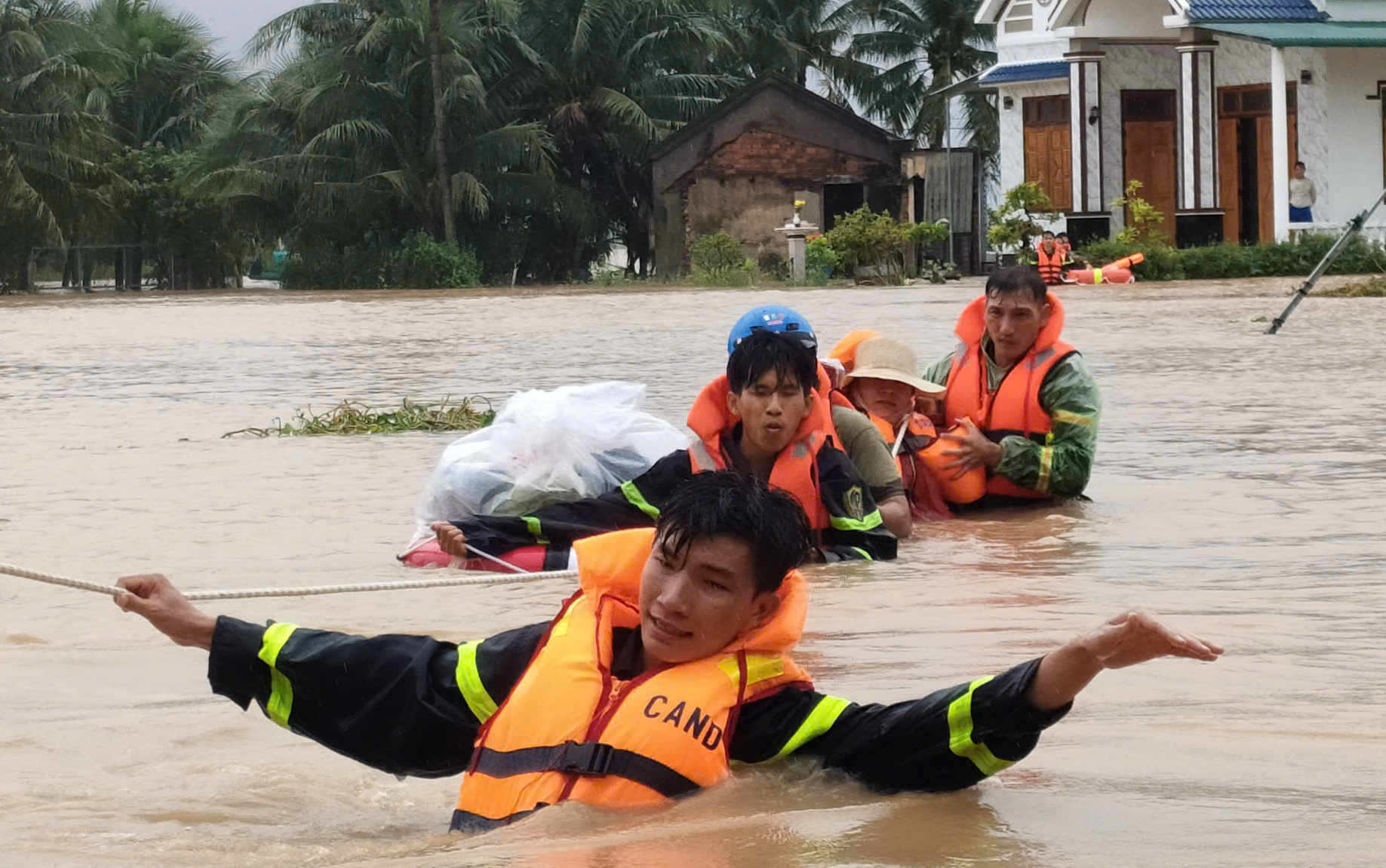 Lực lượng cứu hộ đưa người dân tại xã Hòa Trí đến nơi an toàn. Ảnh: CÔNG AN KHÁNH HÒA