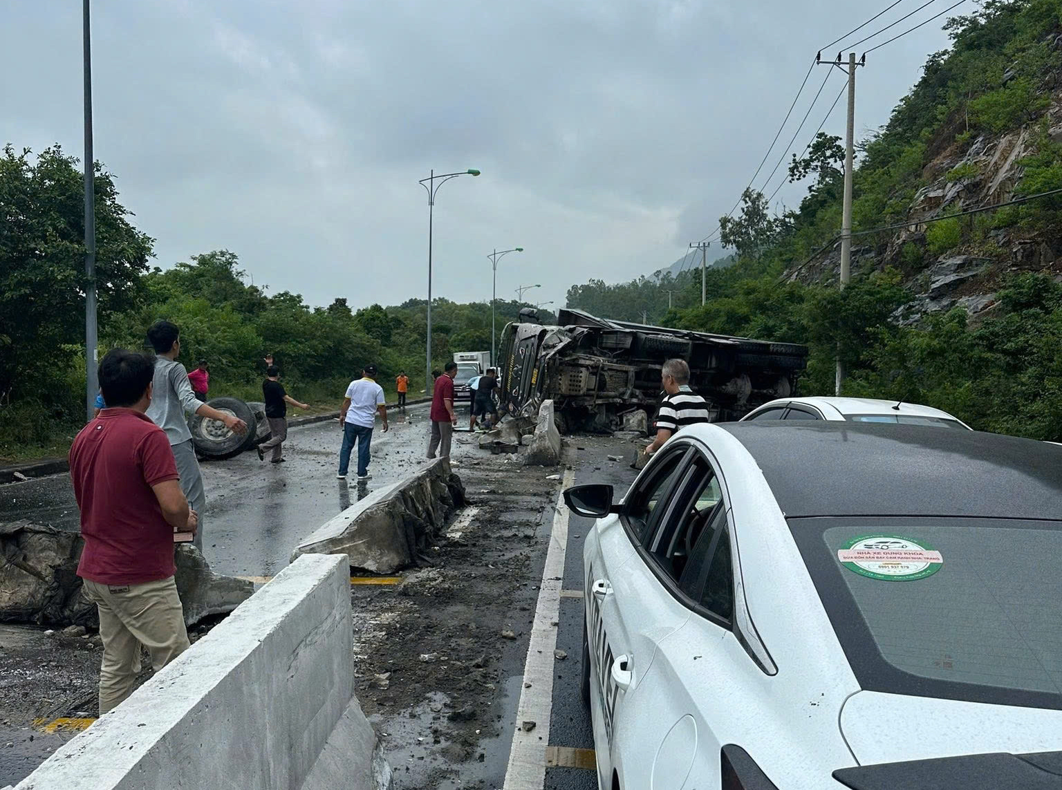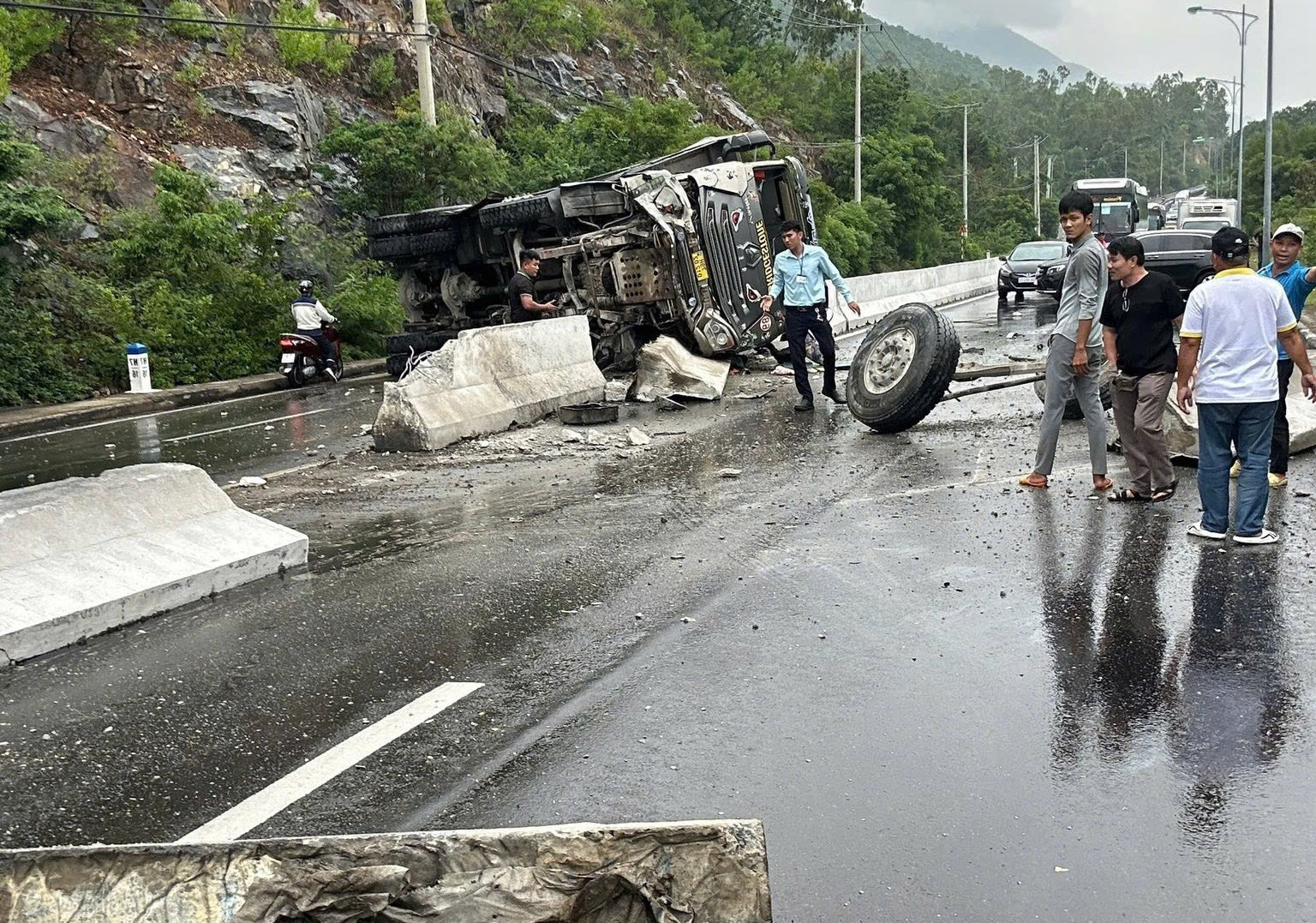 Xe tải lật ngang trên đèo Cù Hin nối Nha Trang và sân bay Cam Ranh. Ảnh: NDCC