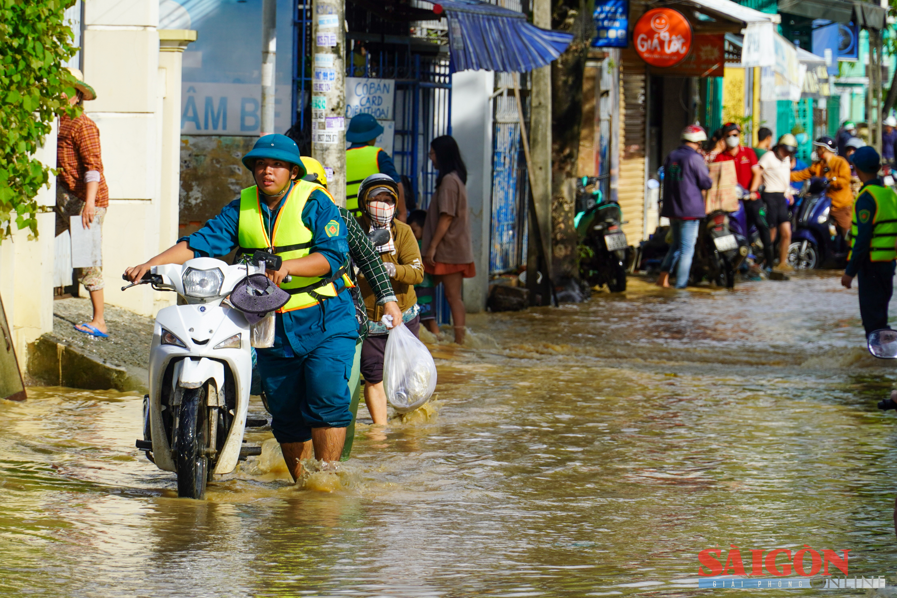 Lực lượng chức năng phường Bắc Nha Trang hỗ trợ người dân đi qua khu vực bị ngập. Ảnh: HIẾU GIANG