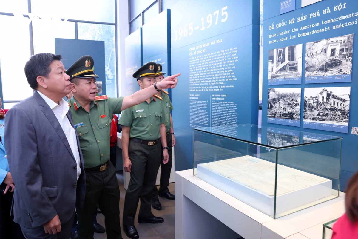Trung tướng Nguyễn Thanh Tùng, Giám đốc Công an TP Hà Nội và Phó Chủ tịch UBND TP Hà Nội Dương Đức Tuấn tham quan các hiện vật tại bảo tàng.