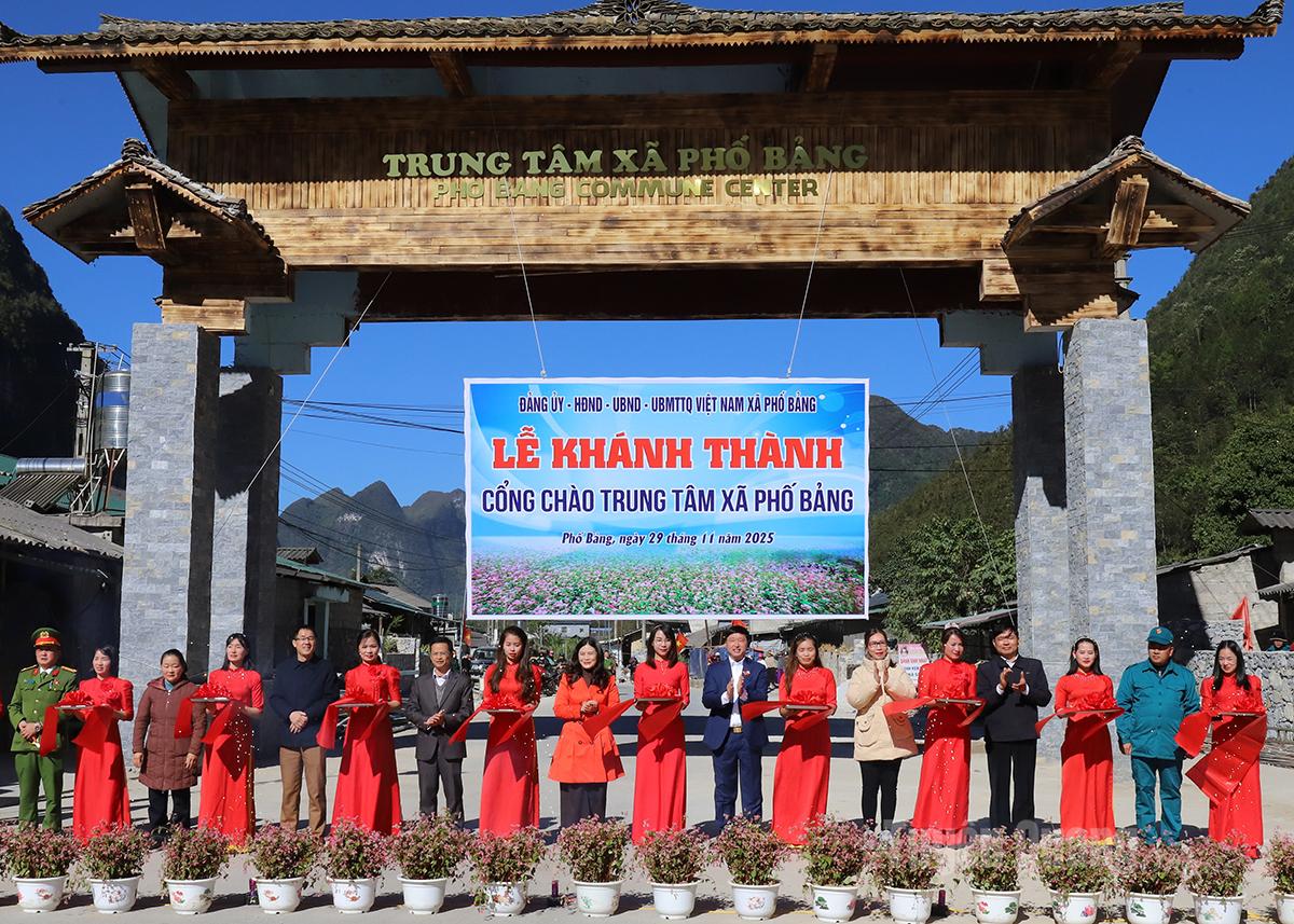 Các đồng chí lãnh đạo cắt băng khánh thành Cổng chào xã Phố Bảng.