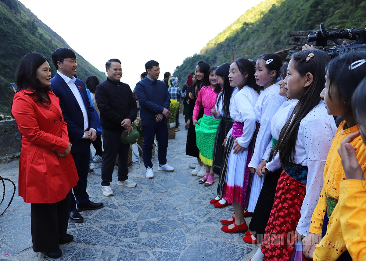 Phó Chủ tịch UBND tỉnh Vương Ngọc Hà động viên các cháu tham gia biểu diễn văn nghệ phục vụ khách du lịch tại khu vực dốc Thẩm Mã.