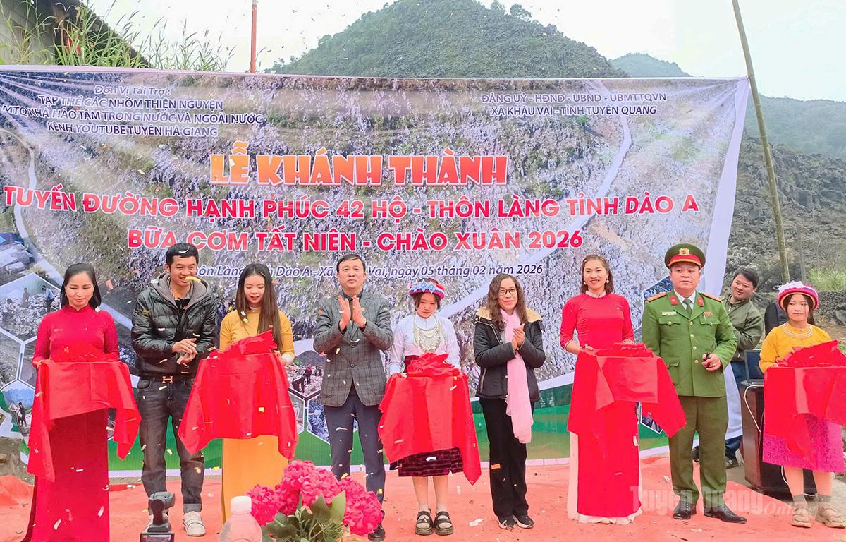 Các đại biểu cắt băng khánh thành công trình đường bê tông tại thôn Làng Tỉnh Dào A, xã Khâu Vai.