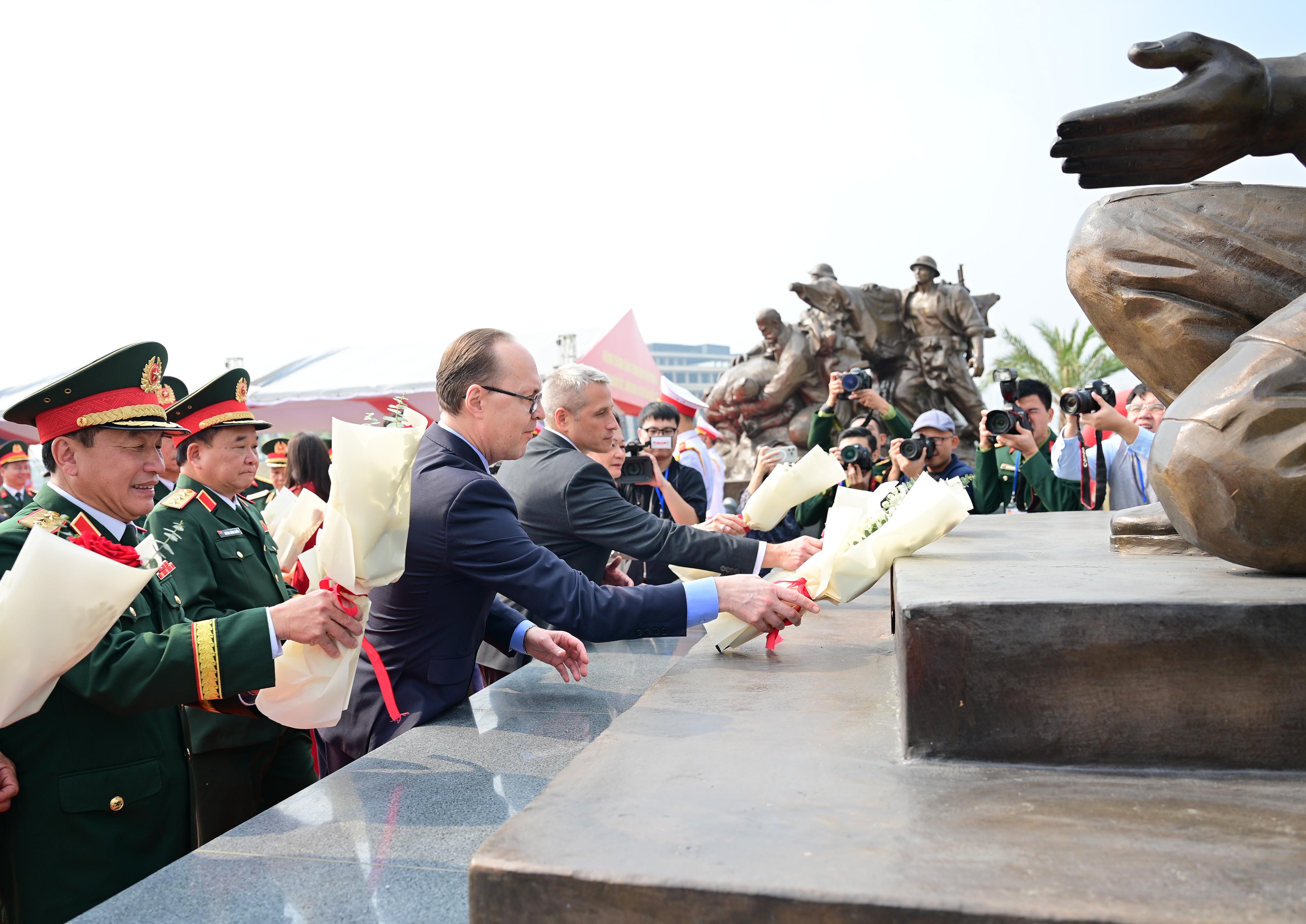 Các đại biểu đặt hoa tại các cụm tượng. Ảnh: ĐỖ TRUNG