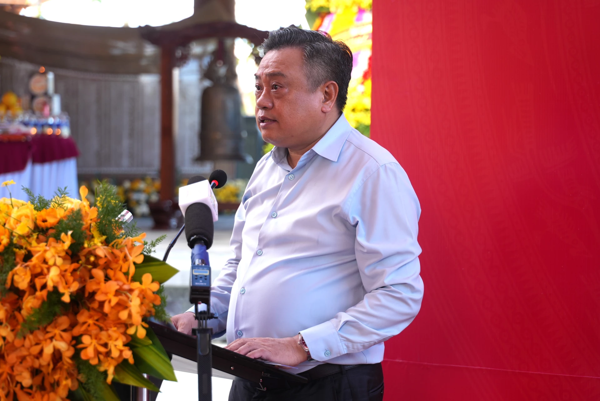 Đồng chí Bùi Thị Minh Hoài, Bí thư Thành ủy Hà Nội và đồng chí Lê Ngọc Quang, Bí thư Tỉnh ủy Quảng Trị thực hiện nghi thức thỉnh chuông tại Đài tưởng niệm Nghĩa trang liệt sĩ Quốc gia Trường Sơn - Ảnh: Trung Đức