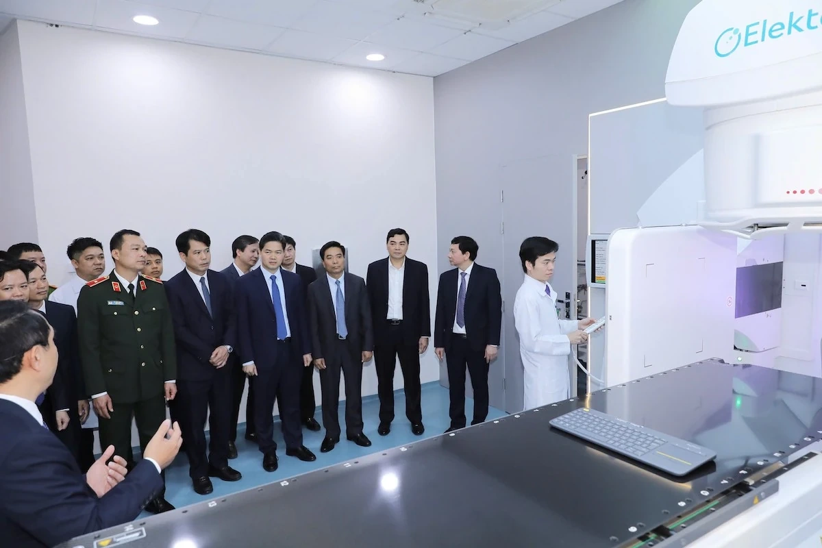 Các đồng chí: Nguyễn Doãn Anh, Ủy viên Trung ương Đảng, Bí thư Tỉnh ủy; Nguyễn Hoài Anh, Ủy viên Trung ương Đảng, Phó Bí thư Tỉnh ủy, Chủ tịch UBND tỉnh; Nguyễn Hồng Phong, Ủy viên dự khuyết Trung ương Đảng, Phó Bí thư Thường trực Tỉnh ủy; Vũ Mạnh Hà, Ủy viên dự khuyết Trung ương Đảng, Thứ trưởng Thường trực Bộ Y tế, cùng các đại biểu tham quan Hệ thống xạ trị gia tốc tại Bệnh viện Ung bướu Thanh Hóa.