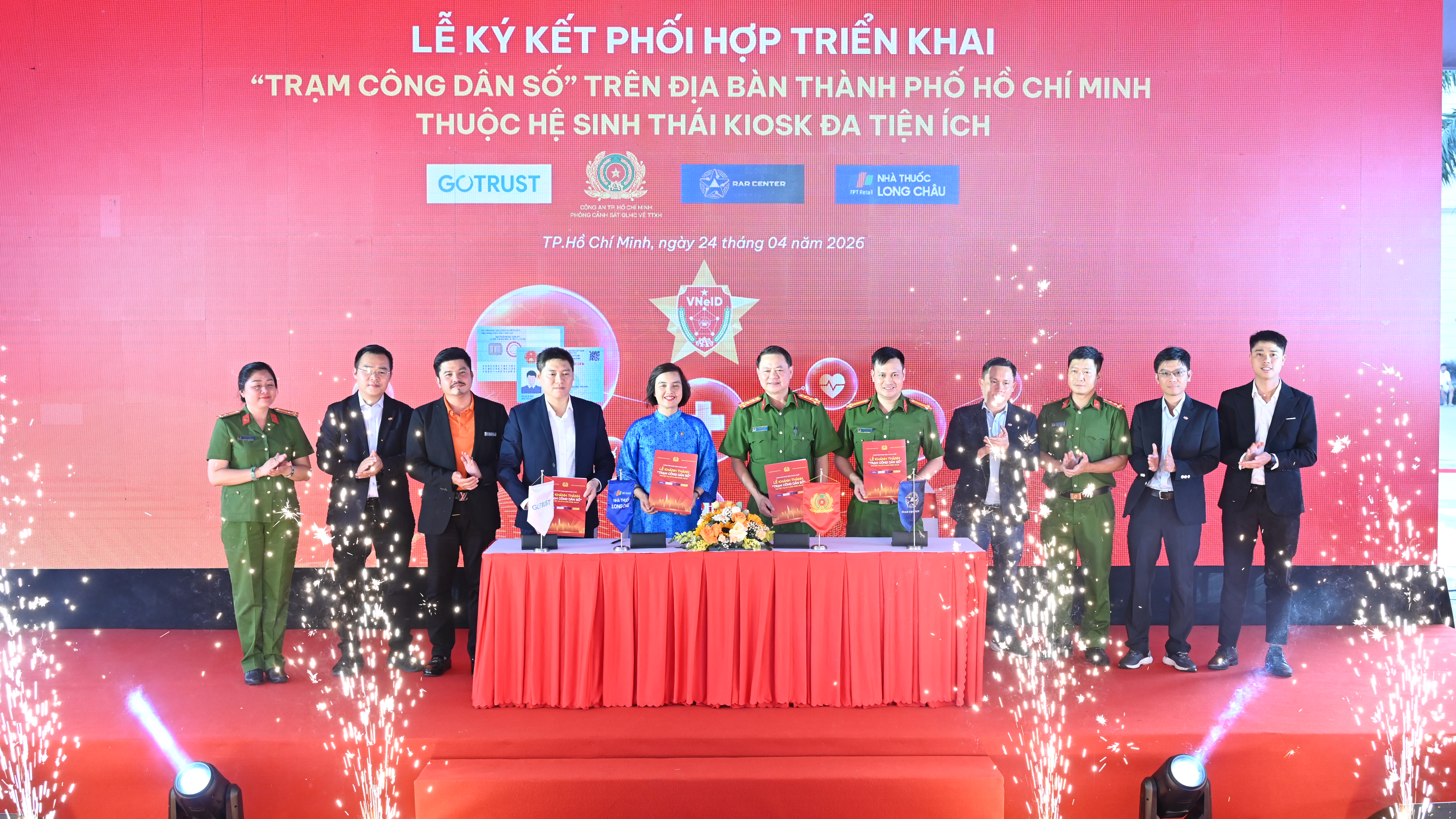 Đại diện các đơn vị, nhà đồng hành ký kết phối hợp triển khai "Trạm công dân số"