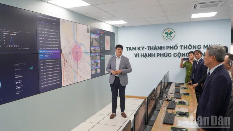 Các đại biểu tham gia tìm hiểu thực tế vận hành của Trung tâm điều hành đô thị thông minh tại phường Tam Kỳ.