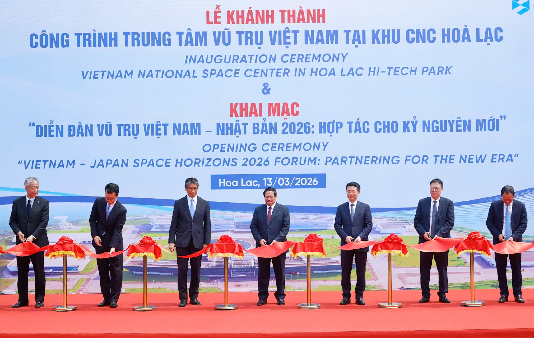Trước khi tham dự diễn đàn, Thủ tướng Phạm Minh Chính và các đại biểu cắt băng khánh thành công trình Trung tâm Vũ trụ Việt Nam - dự án khoa học công nghệ cao đầu tiên được triển khai bằng nguồn vốn vay ODA của Chính phủ Nhật Bản.