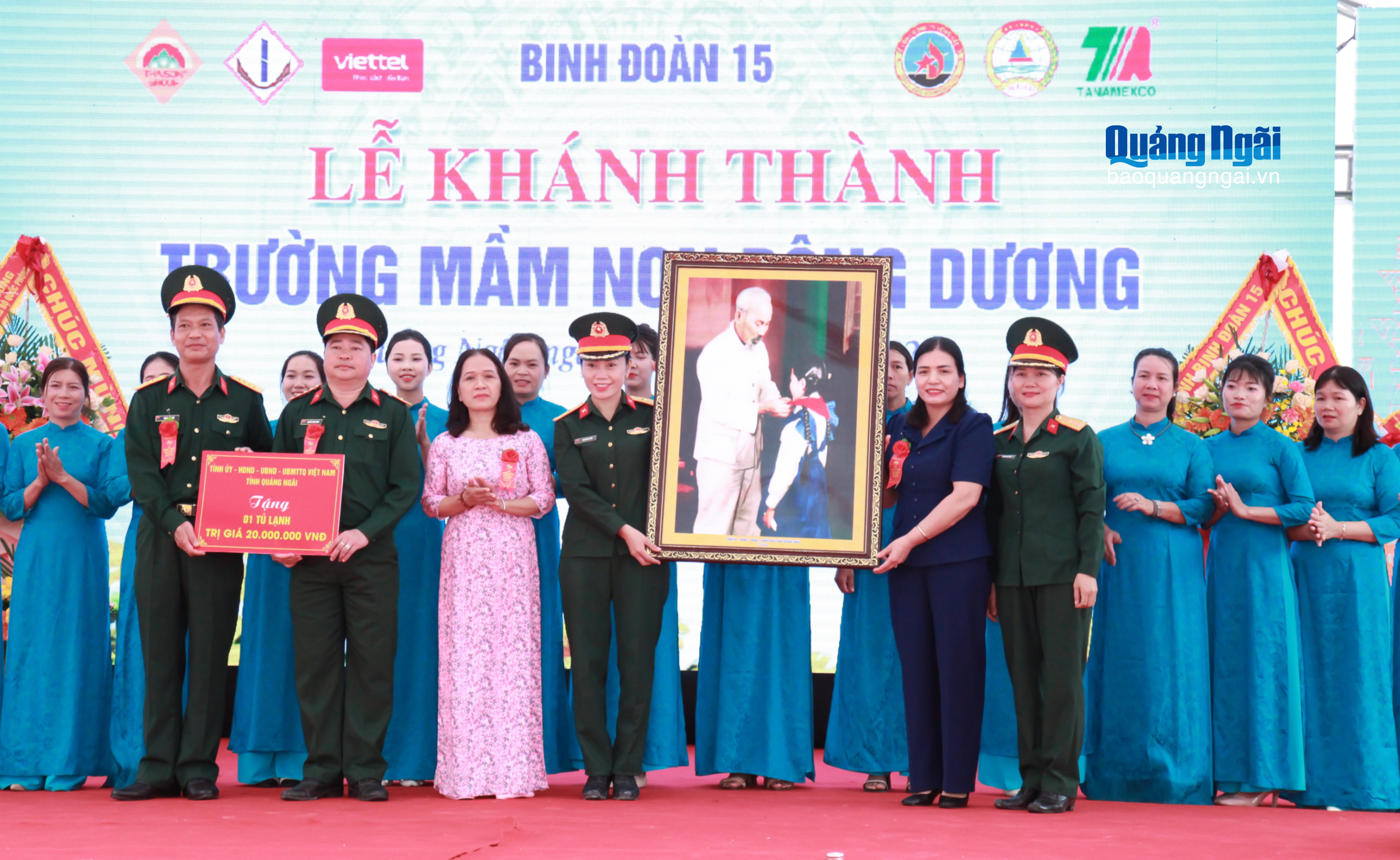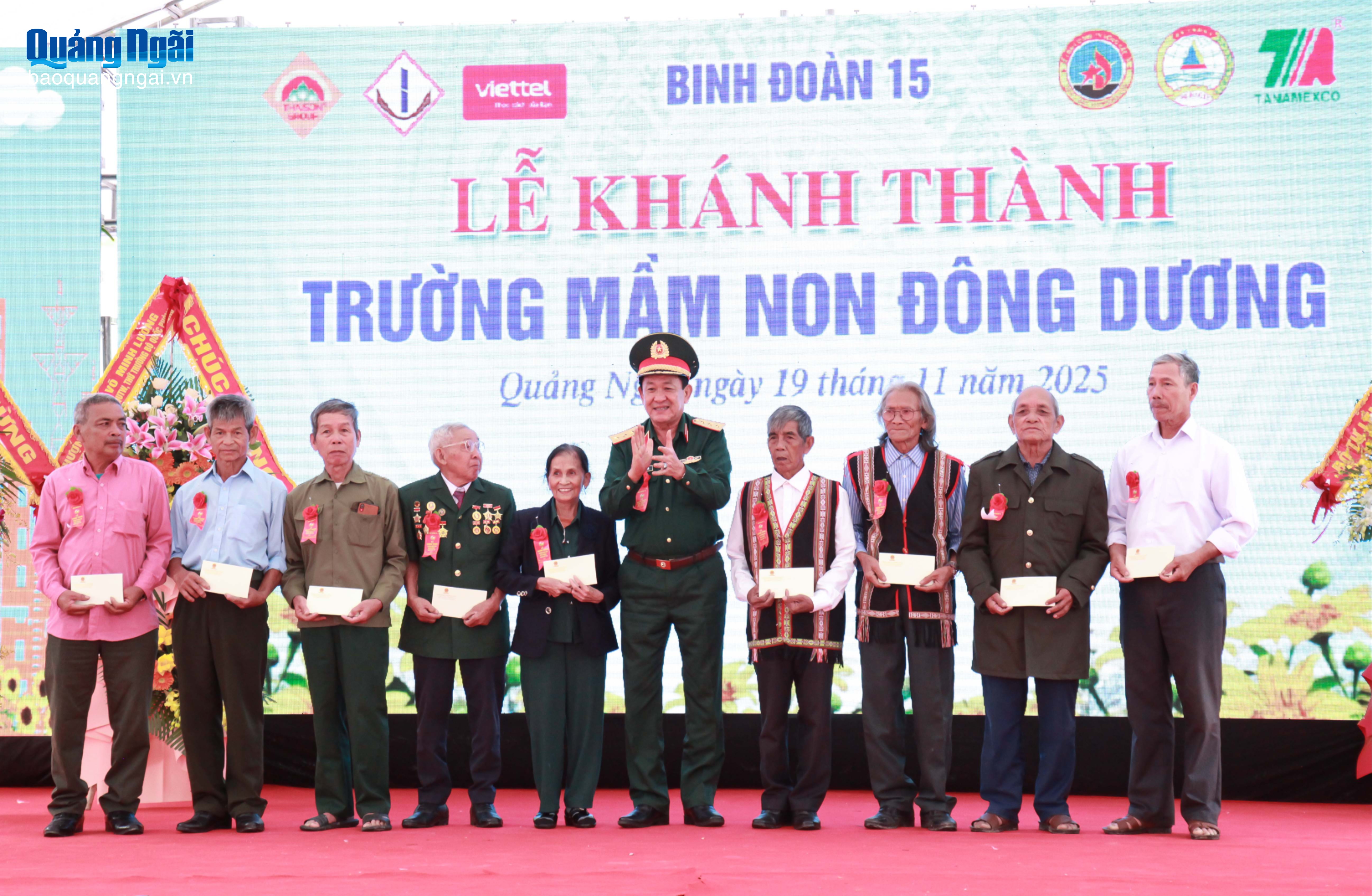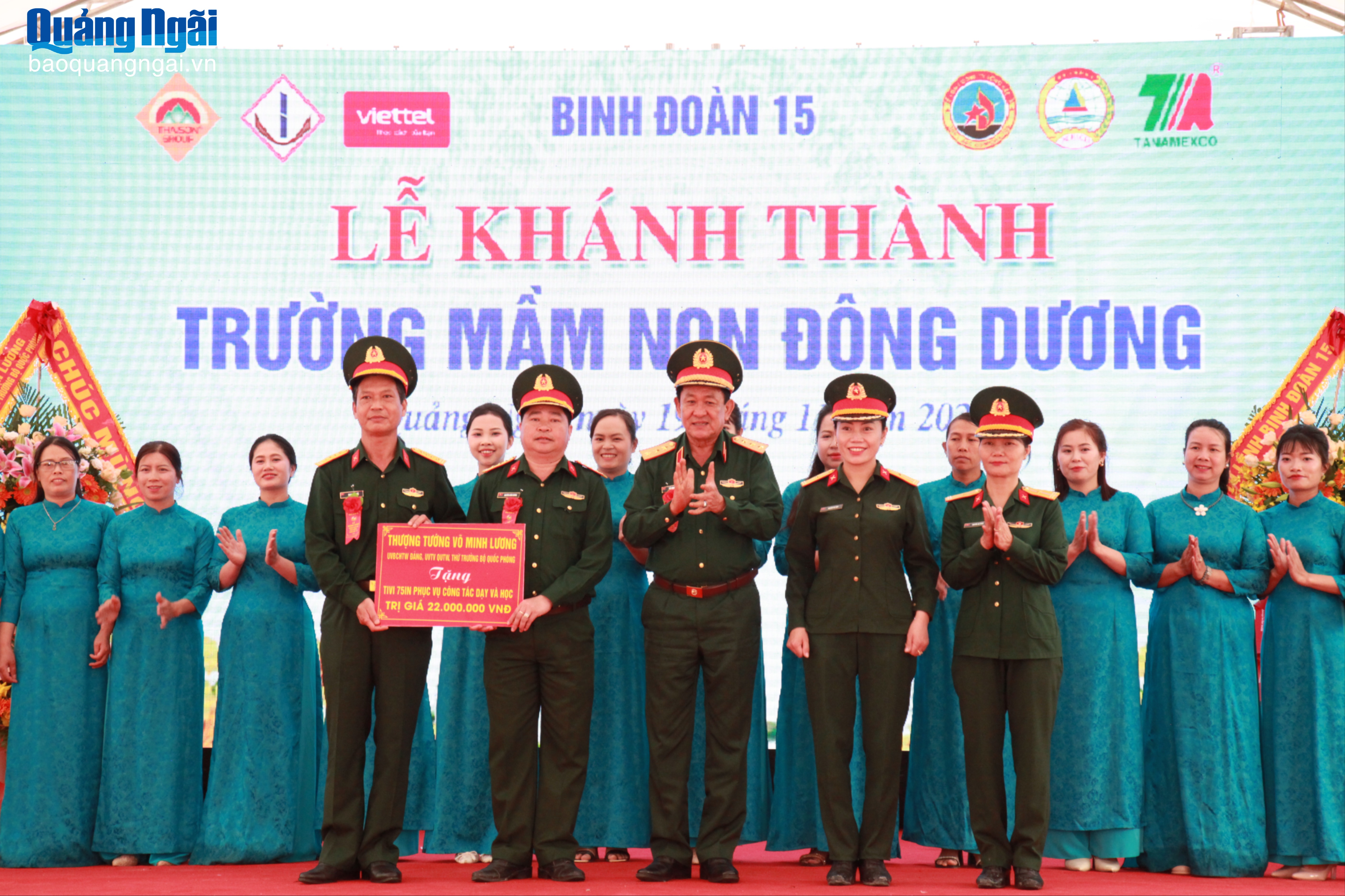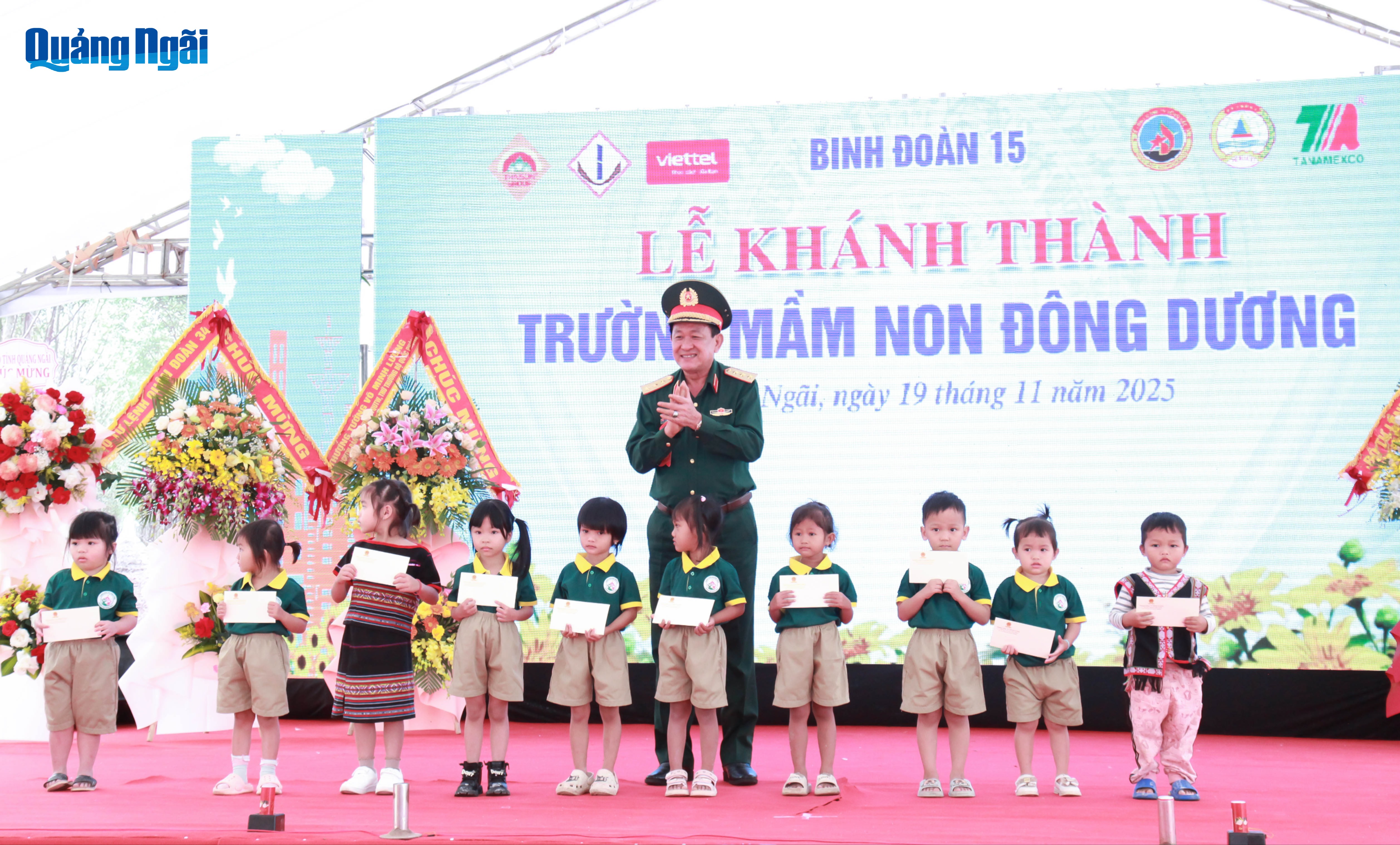 Nhân dịp lễ khánh thành, Đoàn KT-QP 732 và Trường Mầm non Đông Dương được nhận nhiều quà và hoa chúc mừng từ Bộ Quốc phòng, lãnh đạo tỉnh, địa phương và các đơn vị tài trợ.