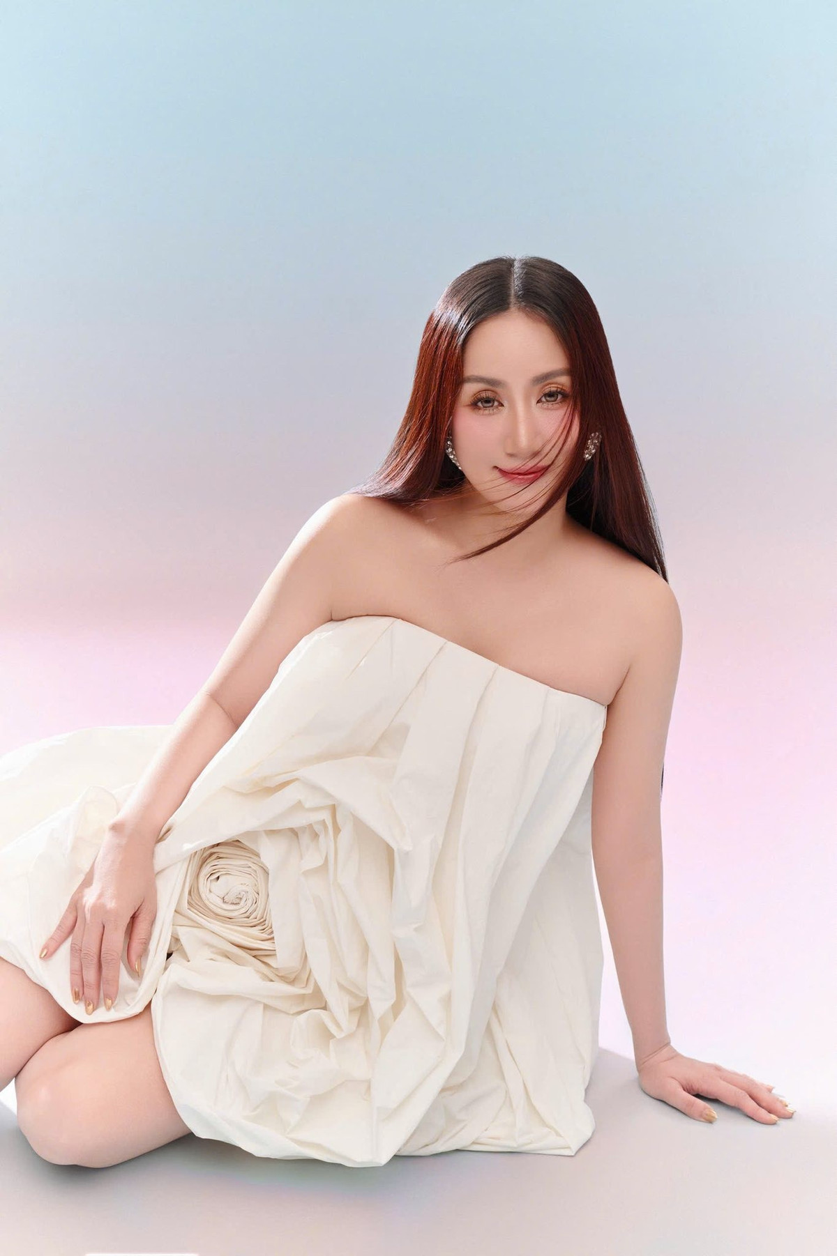 Trong bộ ảnh, Khánh Thi diện chiếc váy trắng bất đối xứng, được tạo hình như một đóa hoa đang nở. Chất liệu nhẹ cùng phom váy suông bay bổng, phần thân xếp nếp thành cánh hoa lớn tạo nên tổng thể vừa nghệ thuật vừa hiện đại.