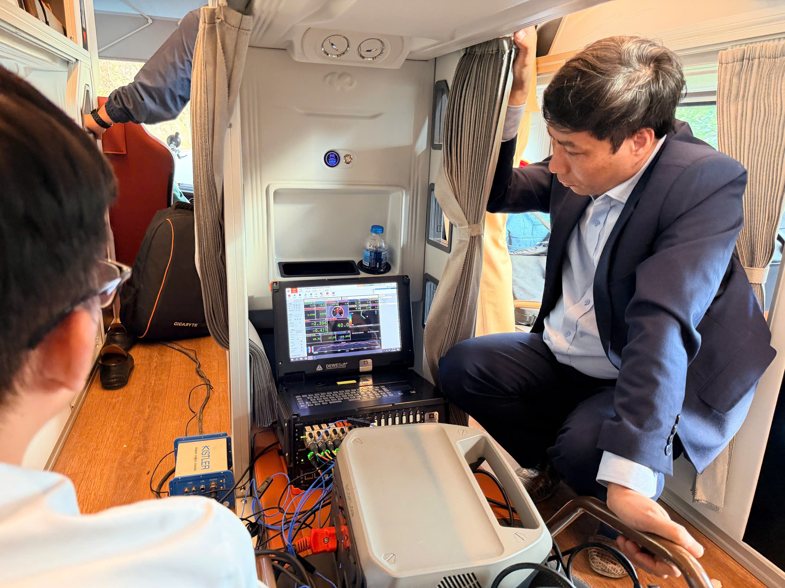Hệ thống thiết bị cảm biến, máy móc được trang bị trên xe giường nằm 2 tầng, nhằm ghi lại thông số kỹ thuật để phục vụ công tác đánh giá. Ảnh: HIẾU ĐÌNH