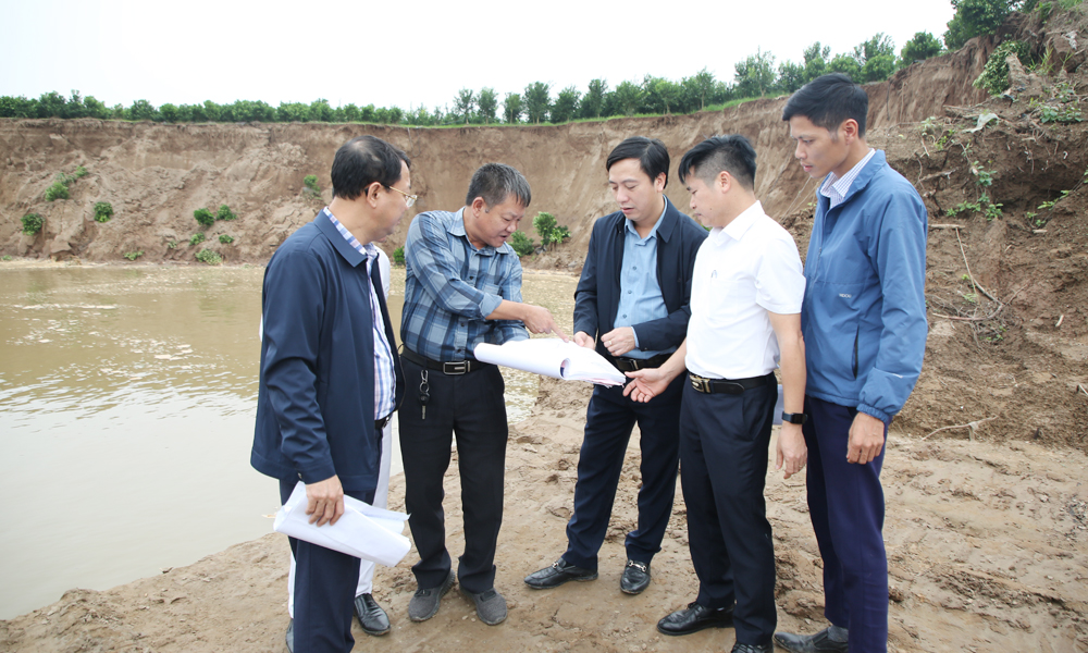 Lãnh đạo Chi cục Thủy lợi, UBND phường Trí Quả kiểm tra sự cố sạt lở bãi sông Đuống thuộc tổ dân phố Đình Tổ.