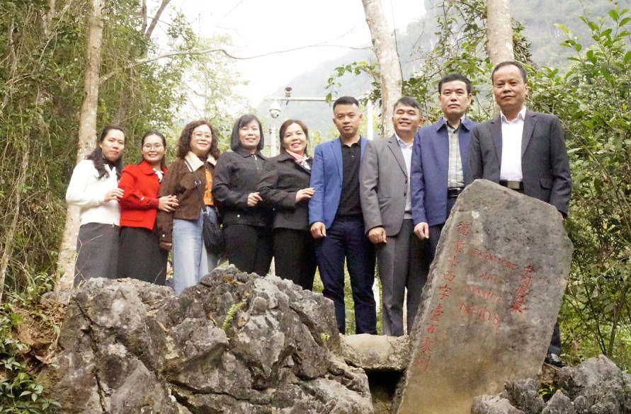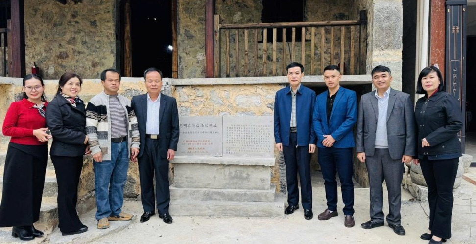 Đoàn công tác chụp ảnh cùng cháu nội ông Hứa Gia Khởi tại Thôn Nâm Quang, thành phố Tịnh Tây, Khu tự trị dân tộc Choang Quảng Tây (Trung Quốc) - địa điểm Chủ tịch Hồ Chí Minh mở lớp huấn luyện chính trị cho 40 chiến sĩ cách mạng trước khi về nước.