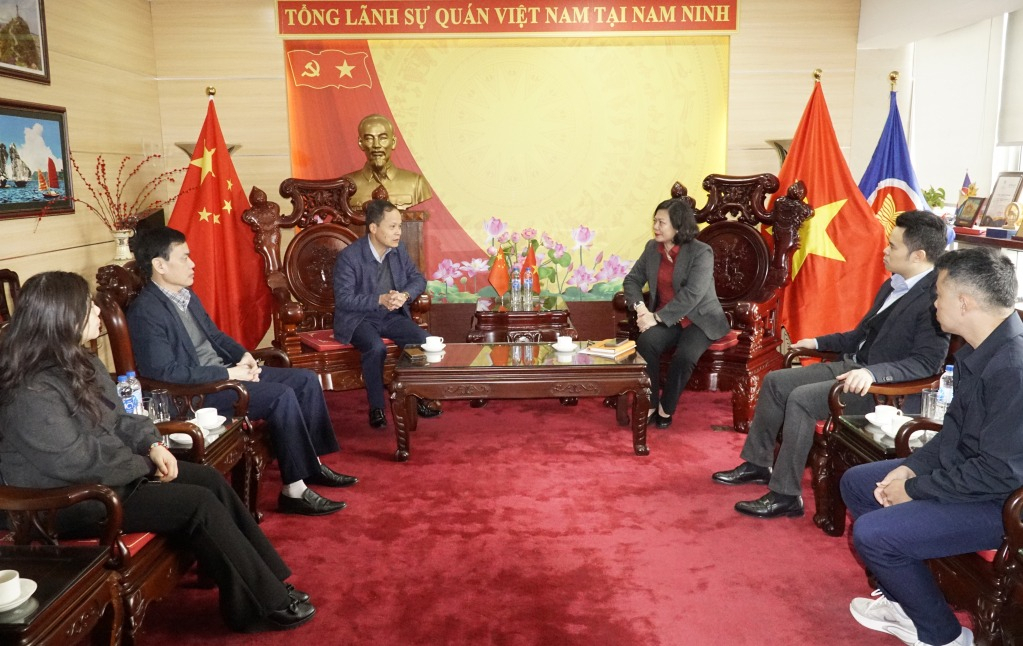 Trong khuôn khổ chuyến công tác, đoàn đến làm việc với Tổng Lãnh sự quán Việt Nam tại Nam Ninh (Quảng Tây, Trung Quốc). Đồng chí Tổng Lãnh sự Nguyễn Thị Hường tiếp và làm việc với đoàn công tác.