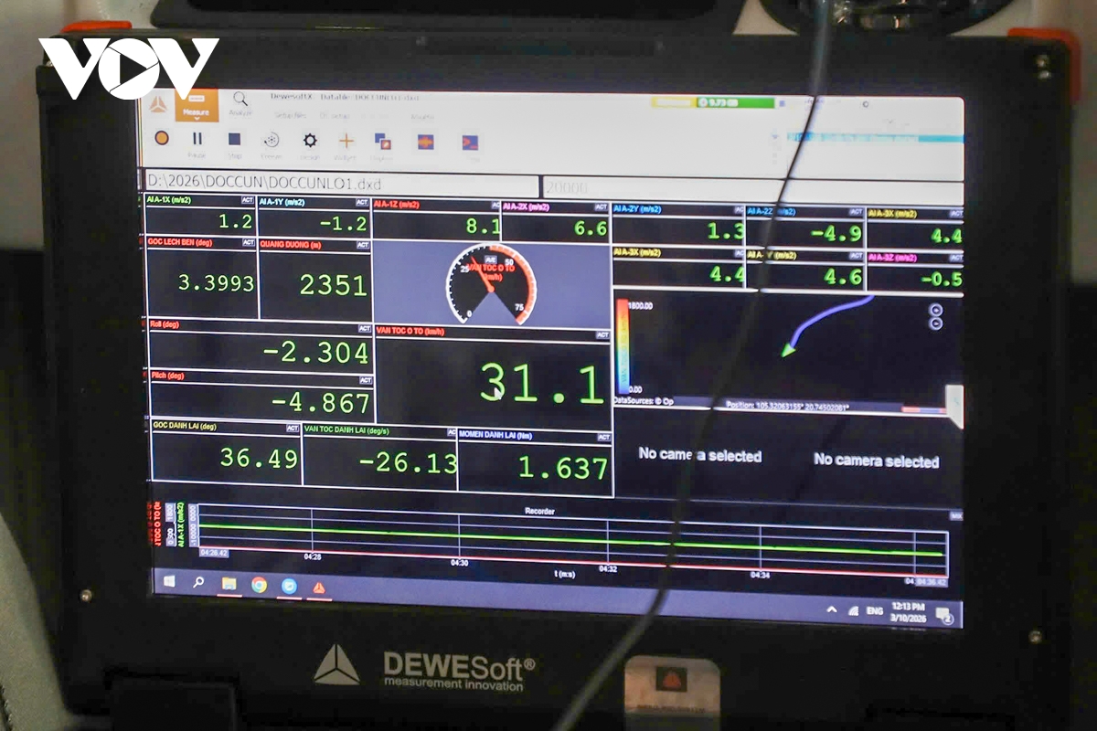 Ghi nhận thực tế, trong quá trình thử nghiệm thực tế, các chuyên gia đã lắp đặt nhiều thiết bị hiện đại trên xe nhằm thu thập các thông số kỹ thuật phục vụ việc đánh giá khả năng vận hành của phương tiện. Hệ thống cảm biến đo gia tốc ba phương được bố trí tại nhiều vị trí khác nhau như khu vực trọng tâm của xe (trên và dưới sàn), cầu trước và cầu sau.