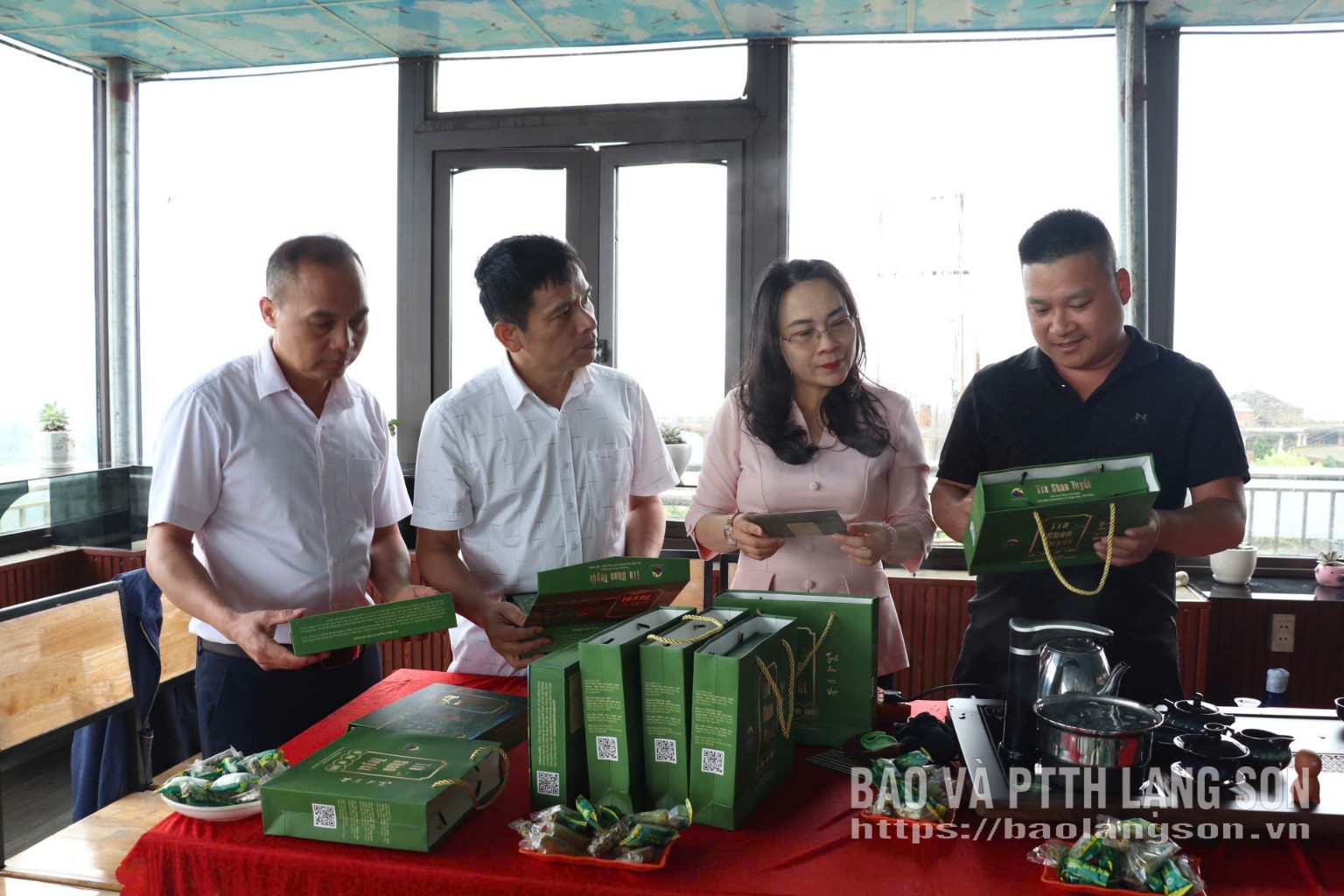 Giám đốc Hợp tác xã Thiên Sơn tươi xanh, chất lượng, bền vững (ngoài cùng bên phải) giới thiệu trà Shan tuyết thành phẩm và quy trình đóng gói sản phẩm