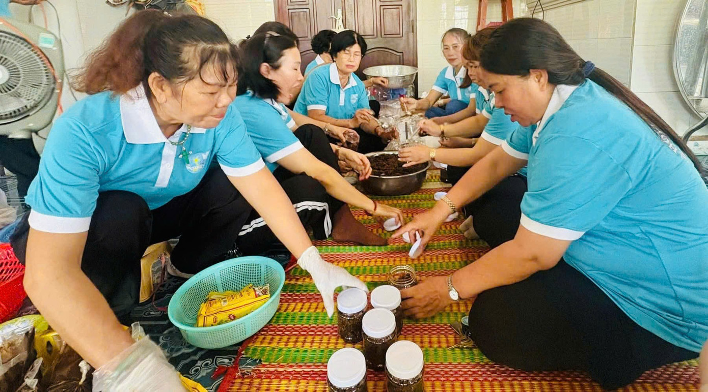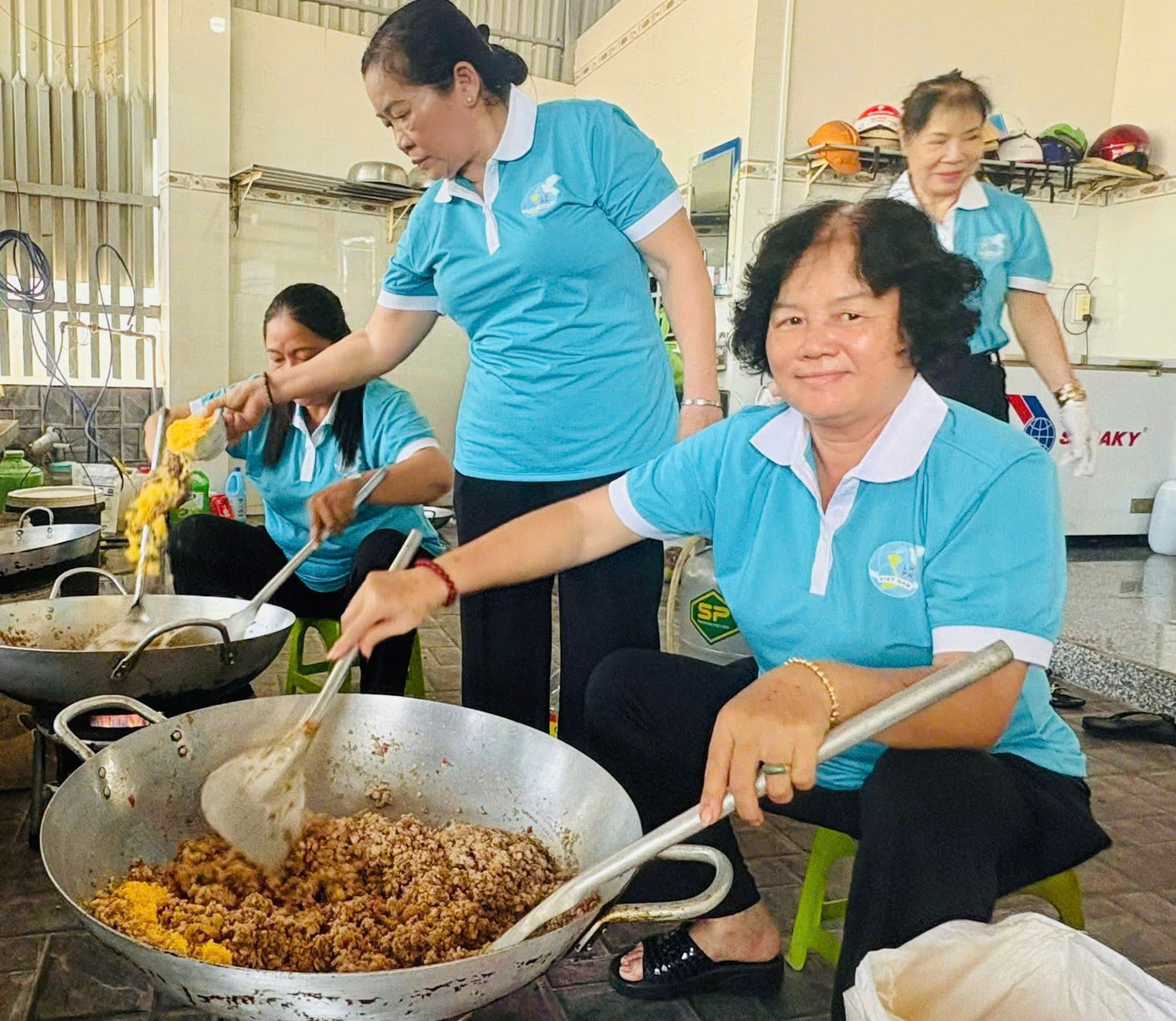 40 cán bộ, hội viên phụ nữ Long Hải cùng chung tay chế biến 500 hủ mắm ruốc xào sả và chà bông để gửi tặng bà con vùng thiên tai ở miền Trung.