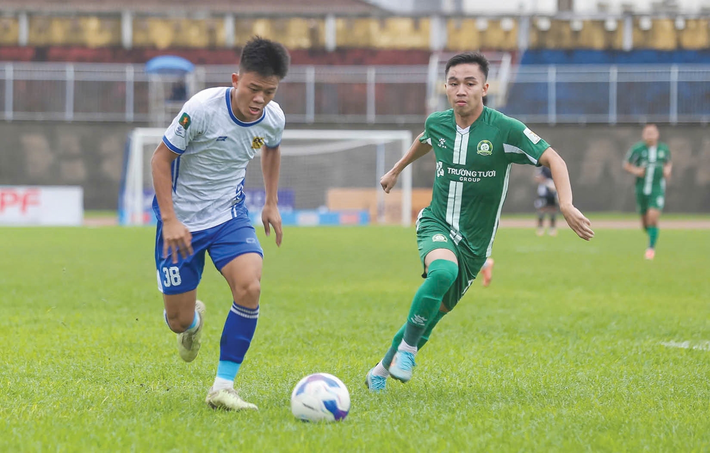 Cầu thủ trẻ Huế (bìa trái) thi đấu tại giải hạng Nhất quốc gia 2024 - 2025