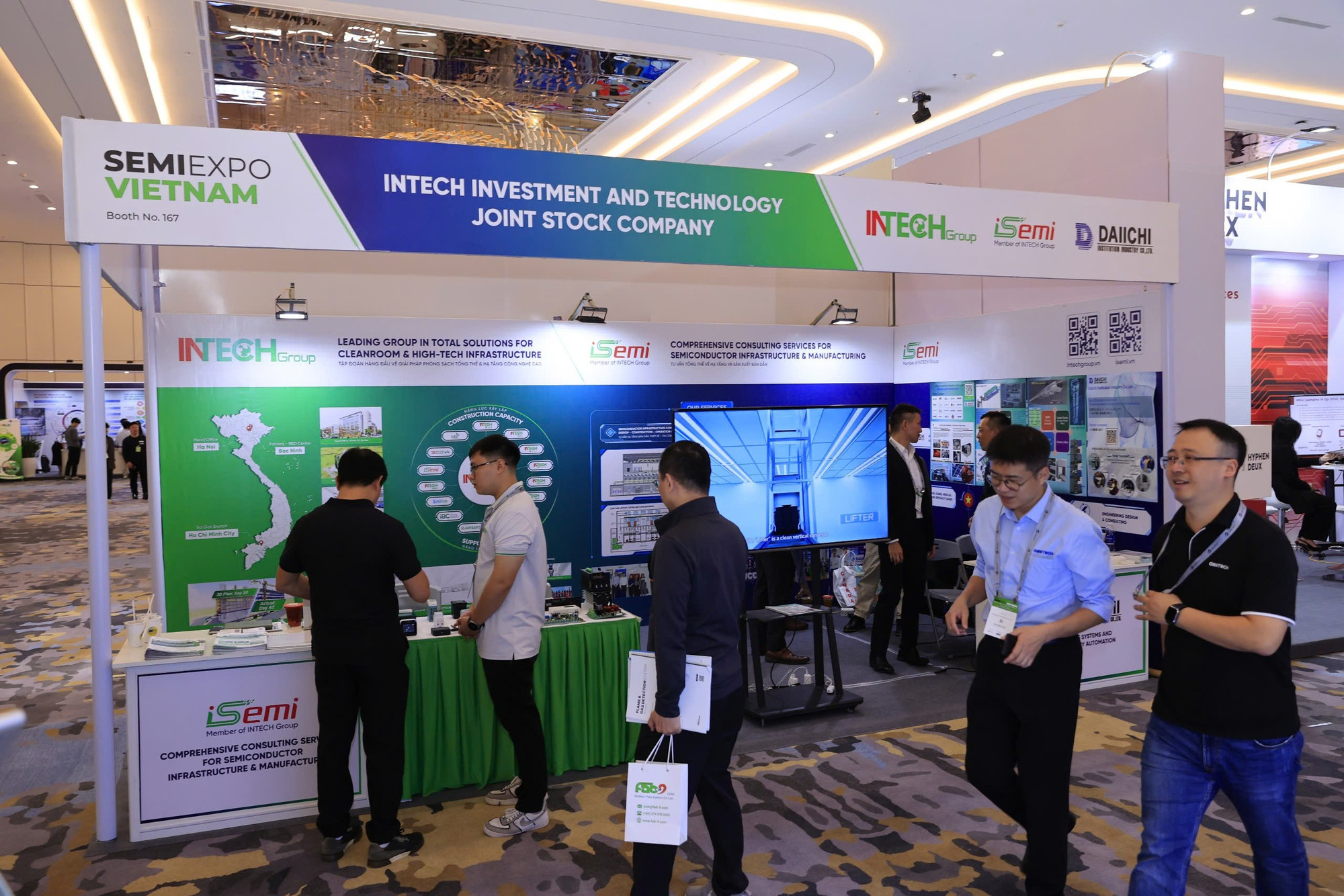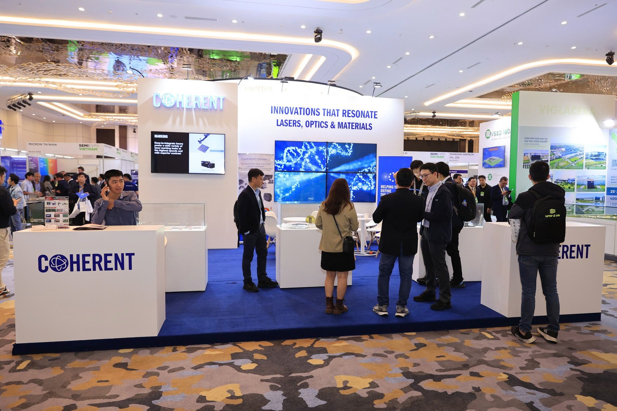 Triển lãm SemiExpo Việt Nam 2025 với sự tham gia của 200 gian hàng đến từ các gã khổng lồ công nghệ, như Lam Researchcó, Coherent, Qorvo, Amkor, GlobalFoundries, Sandisk, Applied Materials, Micron, Tokyo Electron, KLA, STMicroelectronics, Soitec, Sandisk, Kulicke & Soffa, Dassault Systemes, Siemen... (Ảnh: Vietnam+)