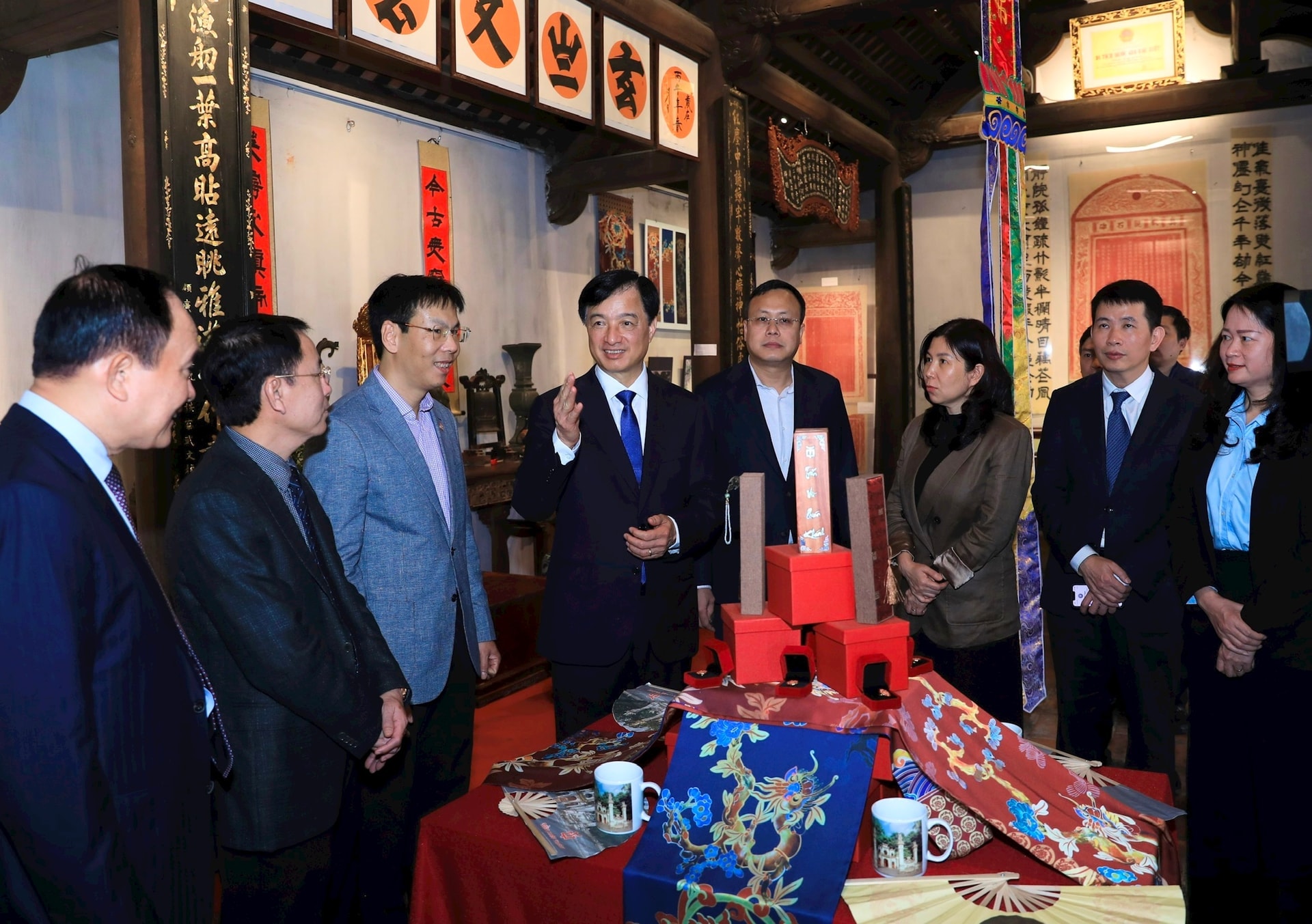 Ủy viên Bộ Chính trị, Bí thư Thành ủy Nguyễn Duy Ngọc và Phó Bí thư Thành ủy, Chủ tịch HĐND Thành phố Phùng Thị Hồng Hà thăm một gian hàng Tết tại đền Voi Phục