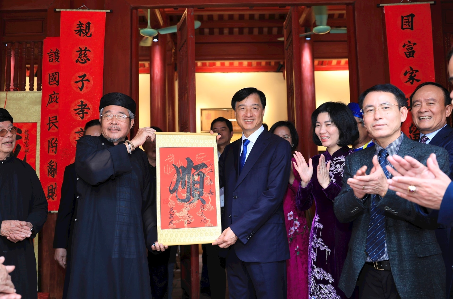 Ủy viên Bộ Chính trị, Bí thư Thành ủy Nguyễn Duy Ngọc được ông đồ viết tặng chữ "Thuận" tại đền Kim Liên