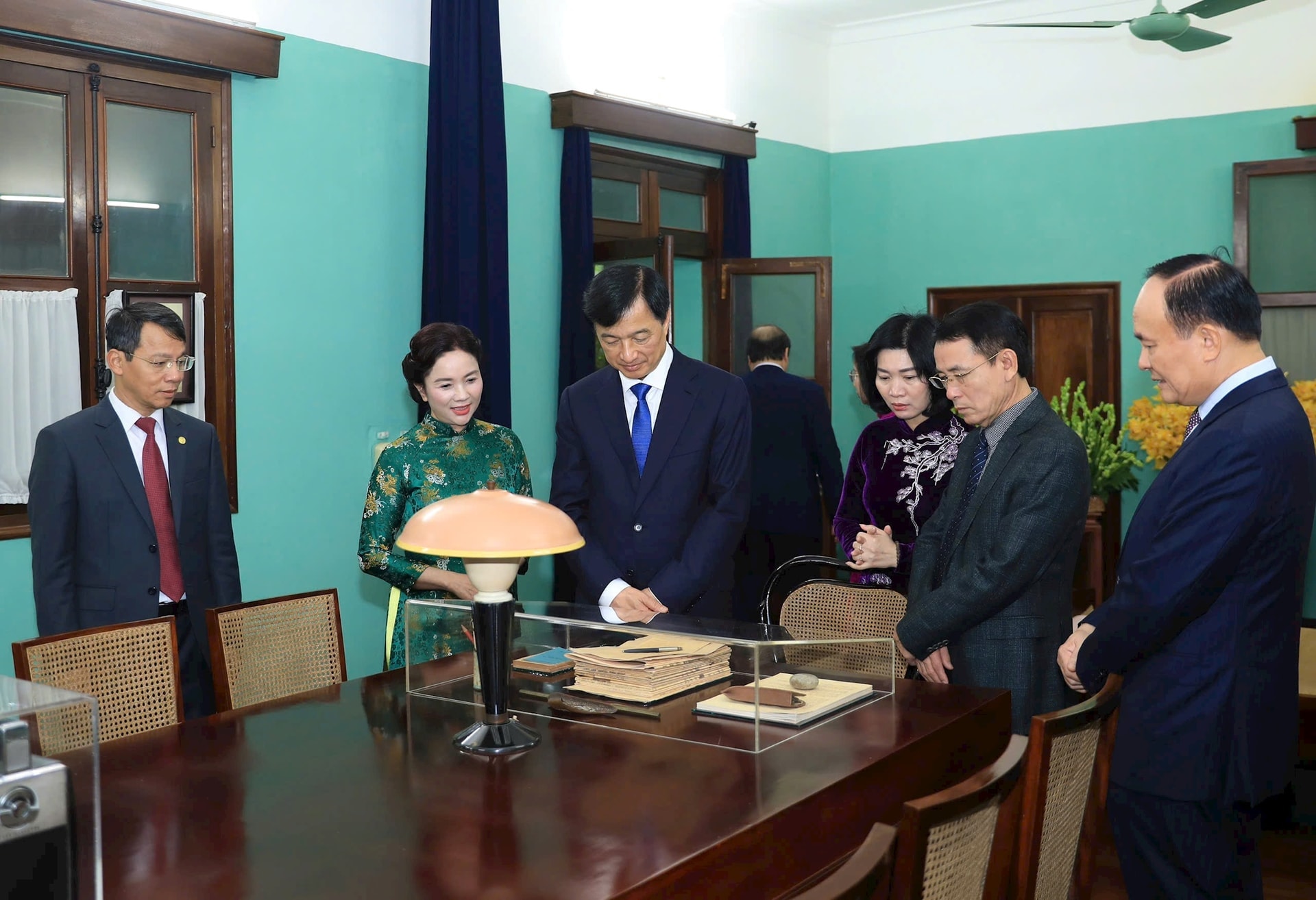 Ủy viên Bộ Chính trị, Bí thư Thành ủy Nguyễn Duy Ngọc và các đồng chí lãnh đạo Thành phố tham quan, nghe giới thiệu về các hiện vật trưng bày tại Nhà 67 ở Khu di tích Chủ tịch Hồ Chí Minh trong Phủ Chủ tịch