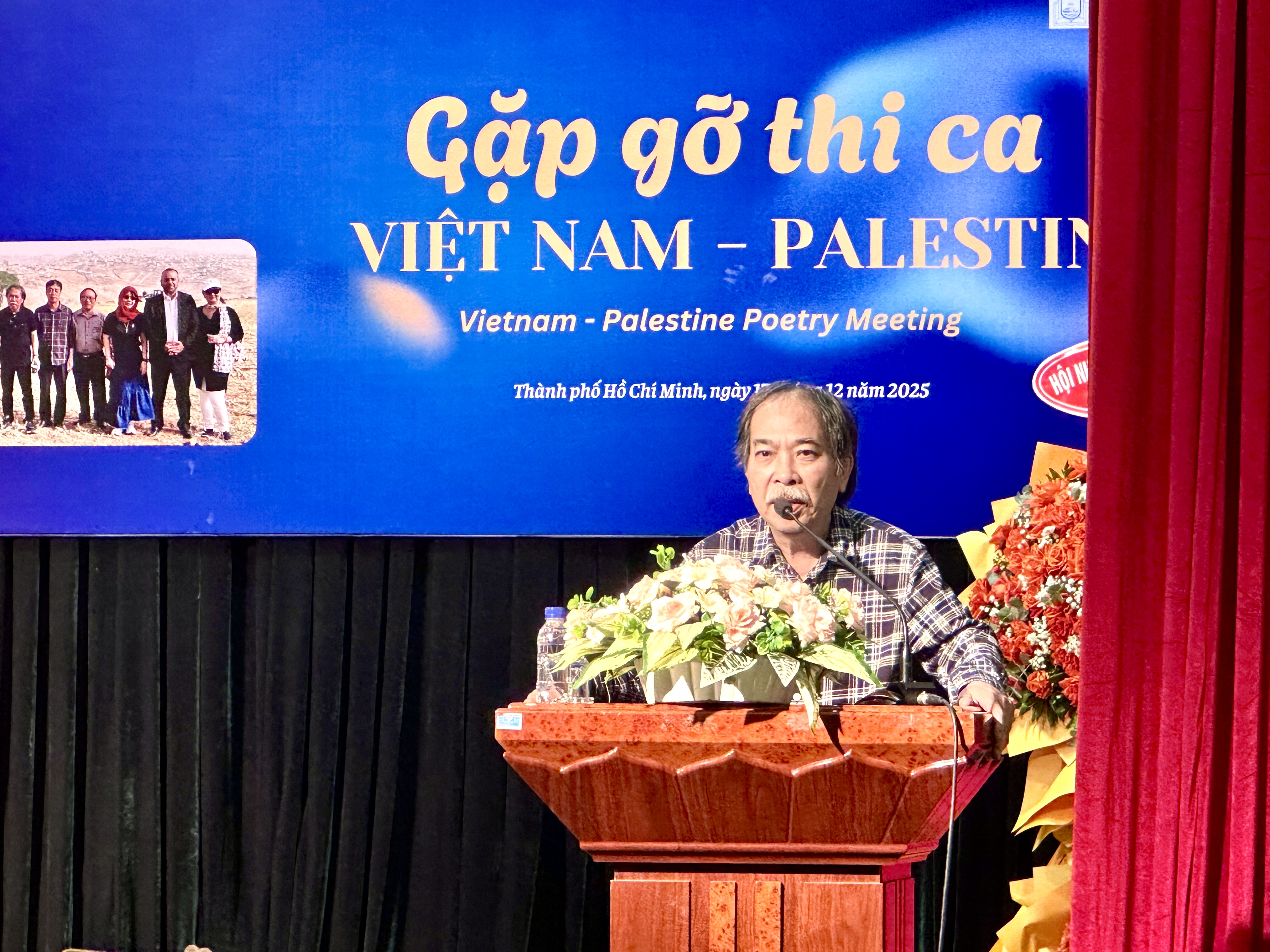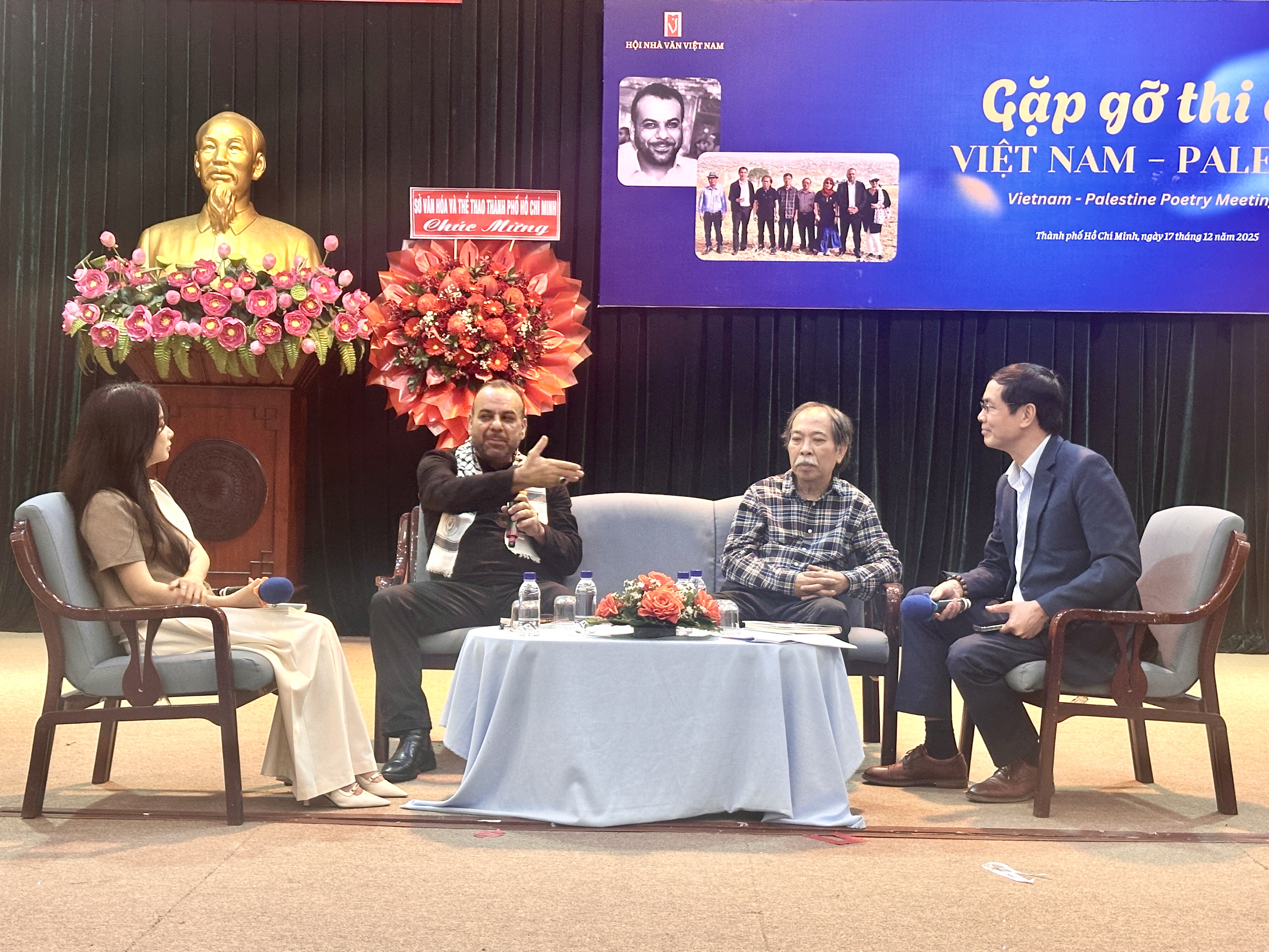 Ngày 17-12, Hội Nhà văn Việt Nam phối hợp cùng Hội Nhà văn TPHCM tổ chức chương trình giao lưu “Gặp gỡ thi ca Việt Nam - Palestine”. Từ Hà Nội, nhà thơ Nguyễn Quang Thiều, Chủ tịch Hội Nhà văn Việt Nam và nhà thơ Hữu Việt, Ủy viên BCH Hội Nhà văn Việt Nam, đã vào TPHCM tham dự chương trình.