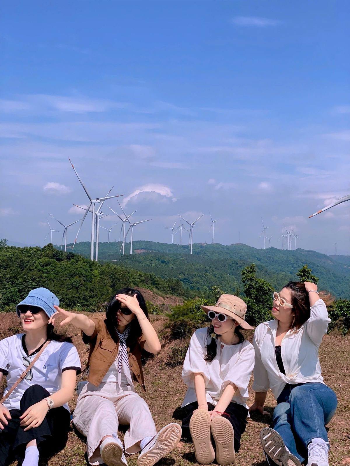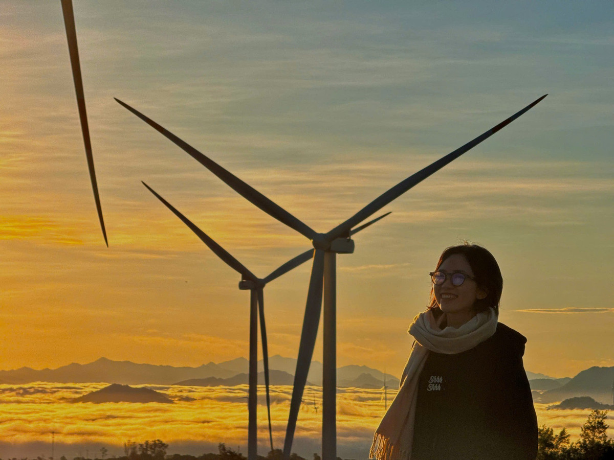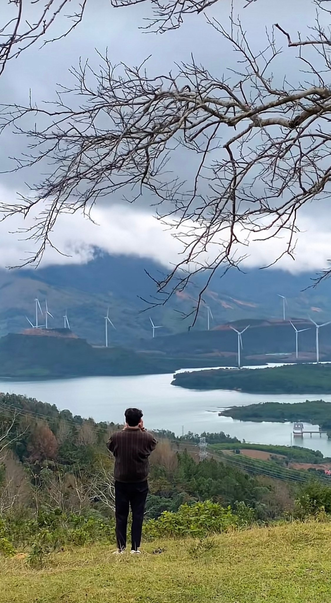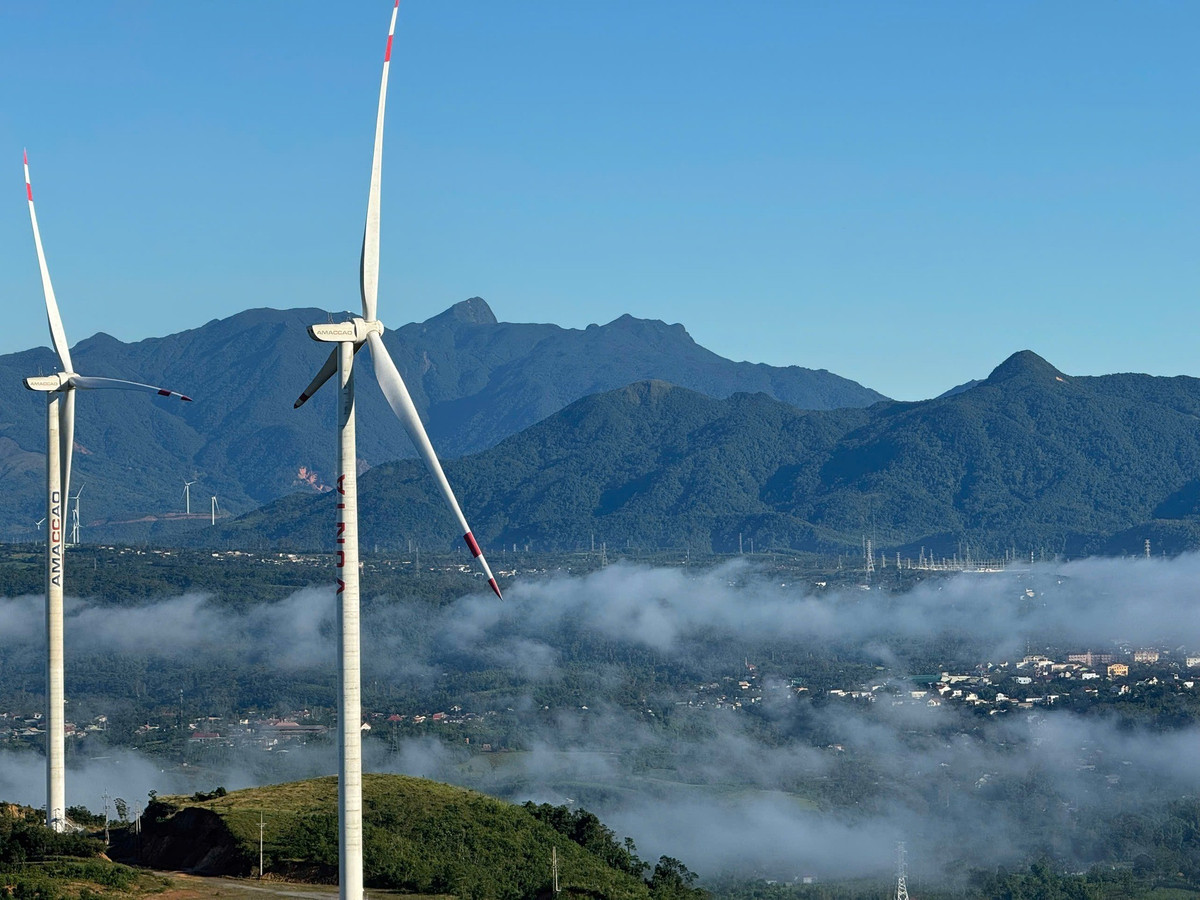 Trong không gian thoáng đạt của núi rừng, hình ảnh những cánh quạt gió quay chậm giữa biển mây tạo nên khung cảnh vừa hùng vĩ vừa bình yên.