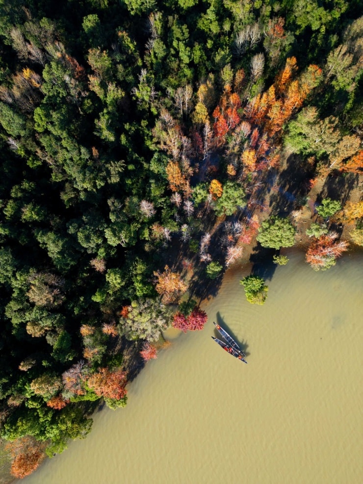 Du khách đi thuyền trên lòng hồ Rào Quán để chụp ảnh cùng những gốc phong ngập nước. Ảnh: Lê Cường
