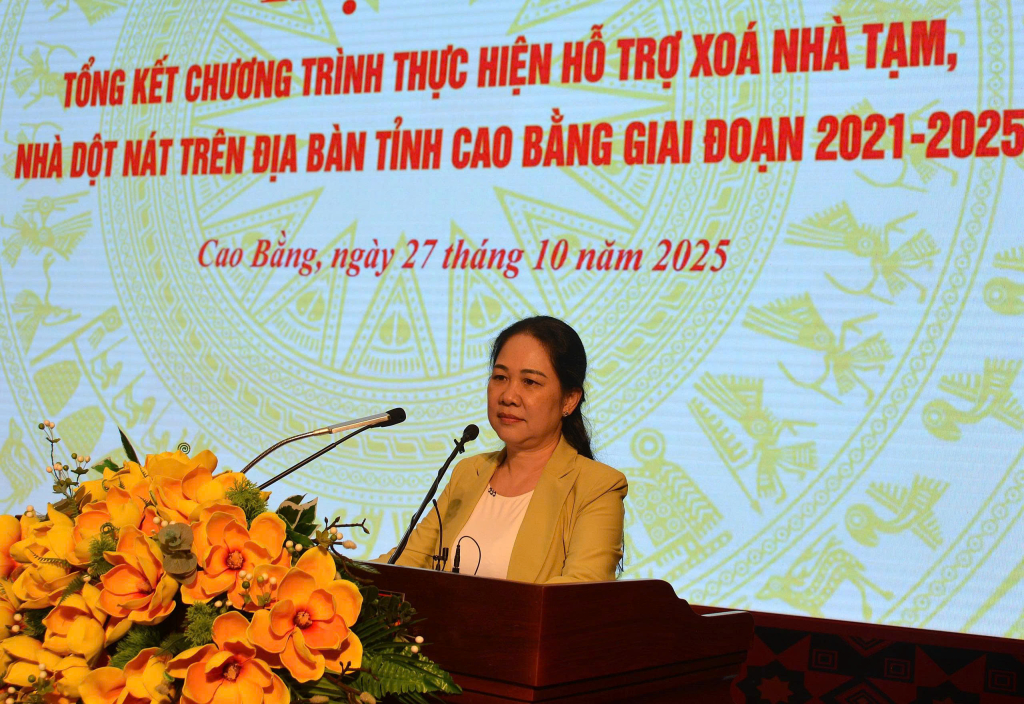 Phát biểu chỉ đạo tại hội nghị, đồng chí Nông Thị Hà, Thứ trưởng Bộ Dân tộc và Tôn giáo biểu dương những kết quả nổi bật tỉnh Cao Bằng đạt được trong thực hiện Chương trình hỗ trợ xóa nhà tạm, nhà dột nát. Đồng chí khẳng định, việc tổ chức tổng kết, khen thưởng tại hội nghị hôm nay không chỉ là sự ghi nhận nỗ lực của cả hệ thống chính trị, mà thể hiện tinh thần quyết tâm, ý chí vươn lên và trách nhiệm của Đảng bộ, chính quyền và nhân dân các dân tộc tỉnh Cao Bằng trong thực hiện mục tiêu phát triển kinh tế - xã hội, bảo đảm quốc phòng, an ninh.