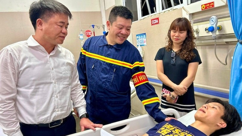 Đại diện Đảng ủy, Ủy ban nhân dân phường Hoàng Mai thăm hỏi, động viên anh Nguyễn Lê Tú, người tham gia giải cứu các nạn nhân vụ cháy tại đường Lĩnh Nam. (Ảnh: Trần Oanh)