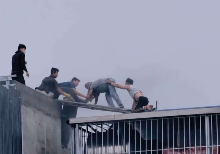 Những người tham gia cứu hộ hỗ trợ các nạn nhân bị mắc kẹt trong vụ cháy thoát sang nhà hàng xóm. (Ảnh: Người dân cung cấp)