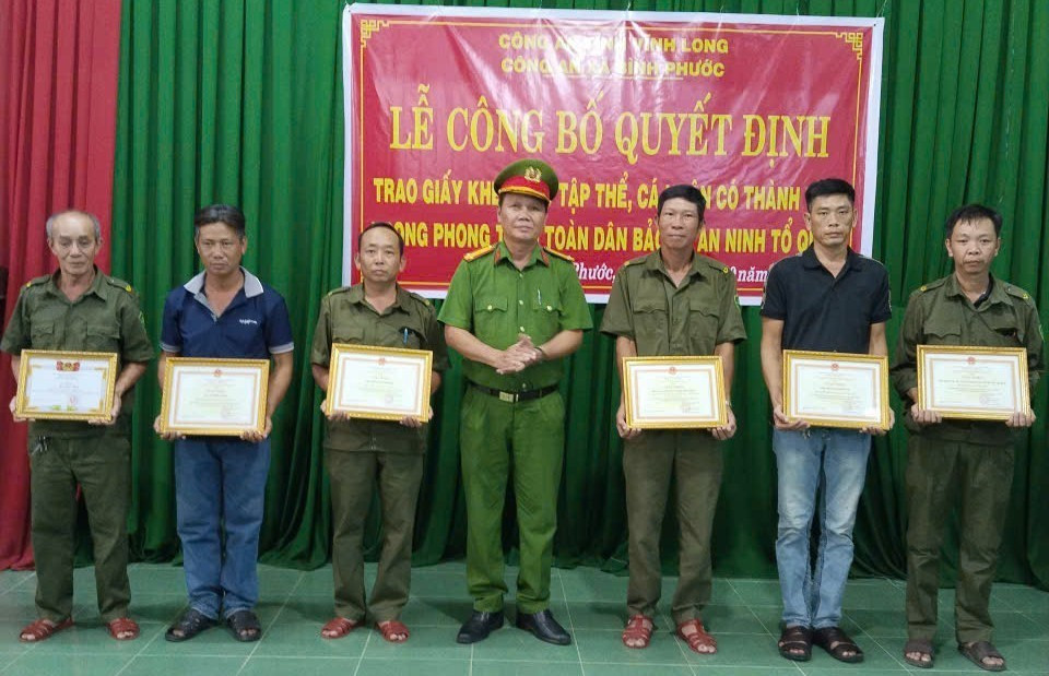 Tại buổi lễ, thừa ủy quyền của Giám đốc Công an tỉnh Vĩnh Long, Công an xã Bình Phước đã trao giấy khen và tiền thưởng cho ông Duy, Long, Vân, ghi nhận thành tích trong phong trào toàn dân bảo vệ an ninh Tổ quốc, góp phần bảo đảm ANTT tại địa phương.